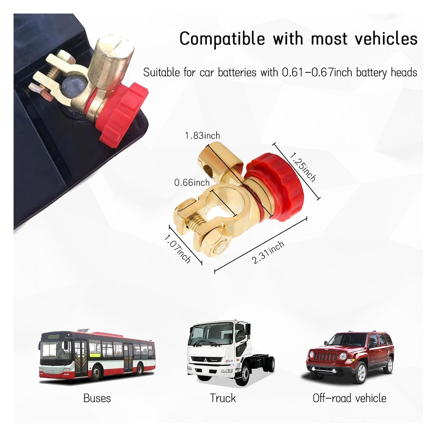 O isolador de desligamento de energia da bateria é compatível com baterias de carro que possuem terminais de 16-17 mm. Com uma corrente nominal de 400A e uma tensão máxima suportada de 12V, ele é adequado para a maioria dos carros, caminhões, vans e SUVs.