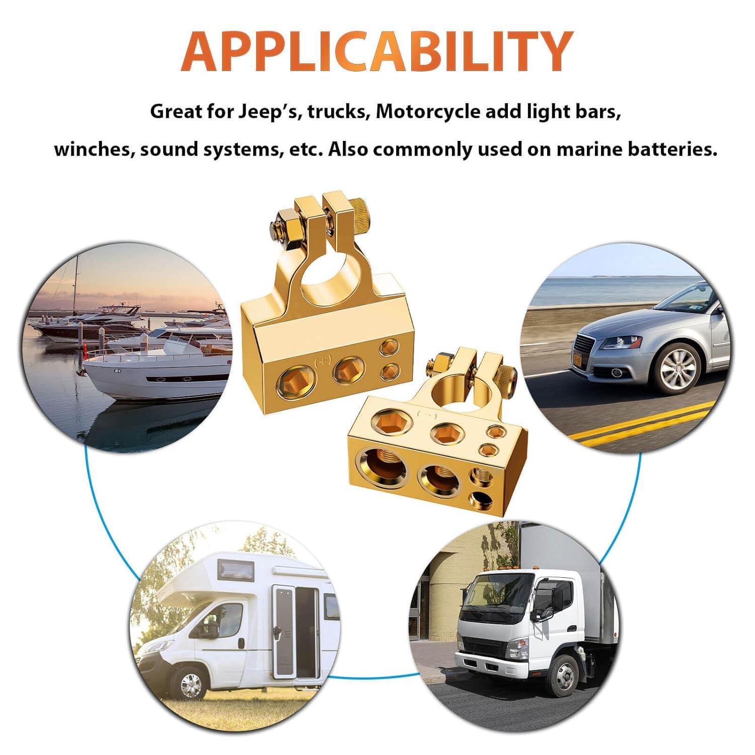 Esses terminais são amplamente utilizados em diversas aplicações, desde Jeeps e caminhões até motocicletas equipadas com barras de luz, guinchos e sistemas de som. Também são comumente utilizados em baterias marinhas, tornando-os uma escolha versátil para qualquer entusiasta de automóveis ou náutica.