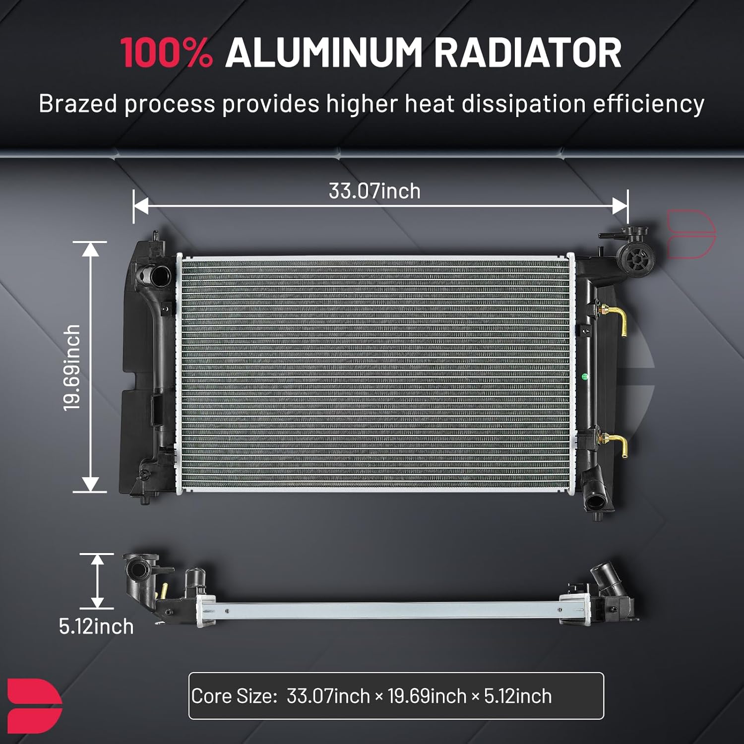 Put this radiator in a 2006 Jeep Wrangler Unlimited. It did not come with the fittings pictured on the product page. They are for attaching the lines from the automatic transmission. My jeep is a manual transmission so I didn’t need them. Also learned I didn’t have to plug the ports in the radiator where the automatic transmission lines go. Just left them open and it didn’t leak. Overall the radiator appears well made, with good looking welds. Everything bolted up correctly, with the exception of having to enlarge one hole on my fan shroud because it didn’t line up the hole on the radiator. I would recommend this radiator as a good all aluminum alternative to much more expensive options.
