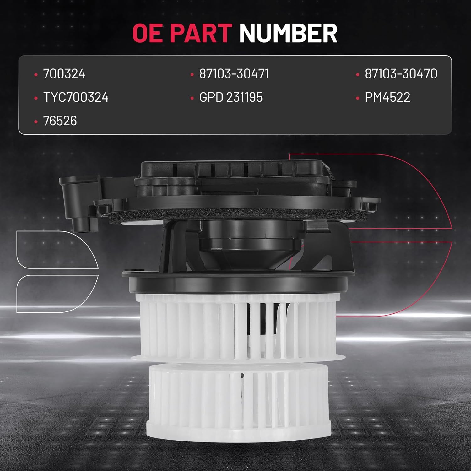 Este motor de ventilador é uma substituição direta para os números de peça OE: 700324, 87103-30471, 87103-30470, 231195, PM4522 e 76526, assegurando que você tenha a peça correta para o seu veículo.
