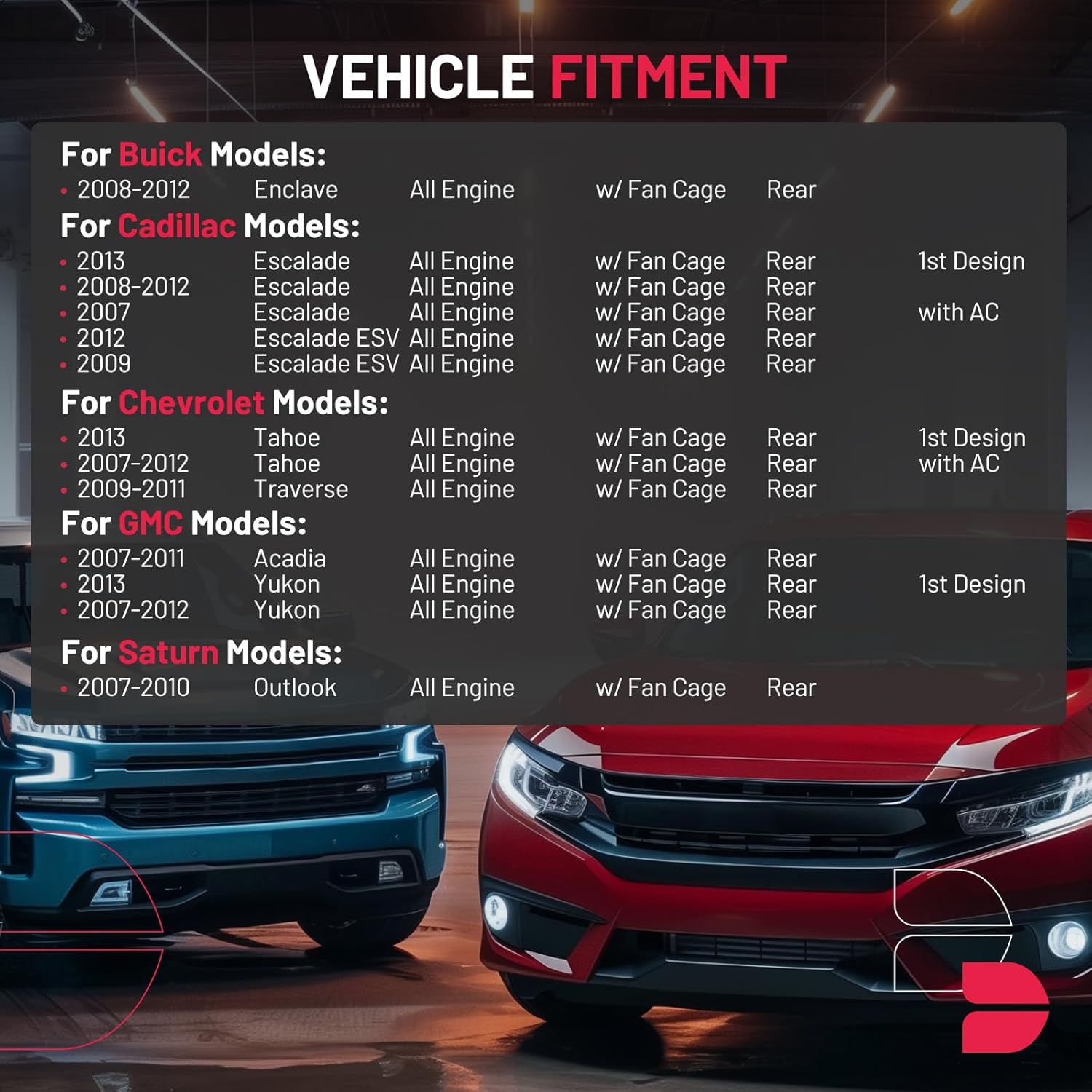 O BDFHYK AC Heater Blower Motor Fan é a solução ideal para quem busca um desempenho excepcional e confiabilidade em sistemas de climatização automotiva. Este motor de ventilador é compatível com uma ampla gama de veículos, incluindo o Buick Enclave (2008-2012), Cadillac Escalade (2007-2013), Chevy Tahoe (2007-2013), GMC Acadia (2007-2011) e Saturn Outlook (2007-2010). Antes de realizar a compra, é fundamental confirmar a compatibilidade com base no ano, modelo e número da peça original do seu veículo.