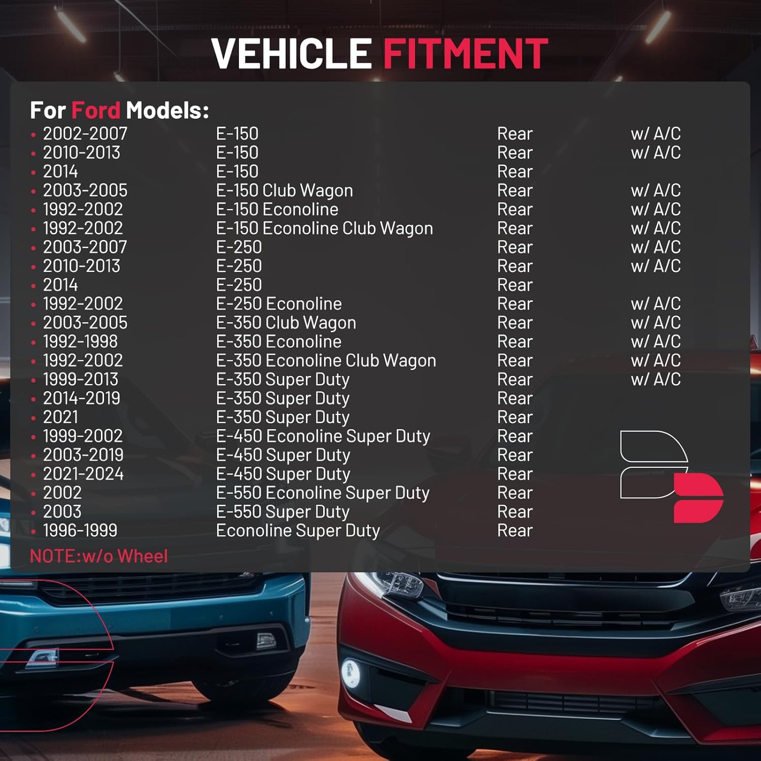 - Informações de Compatibilidade: Compatível com Ford E-150 E-250; E-150 E-350 Club Wagon; E-150 E-250 E-350 Econoline; E-150 Econoline Club Wagon; E-350 E-450 E-550 Econoline Club Wagon; E-350 E-450 E-550 Super Duty. Confirme a compatibilidade de acordo com o ano/marca/modelo do seu veículo e o número OE da peça substituível.