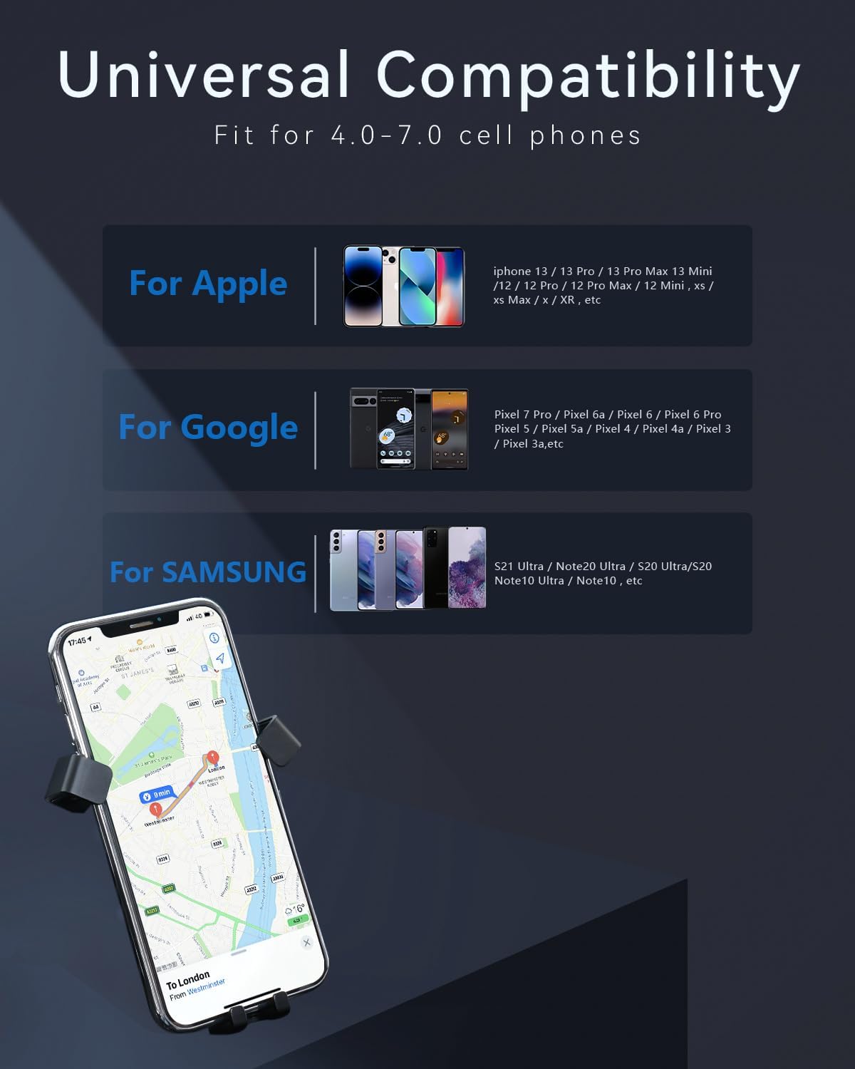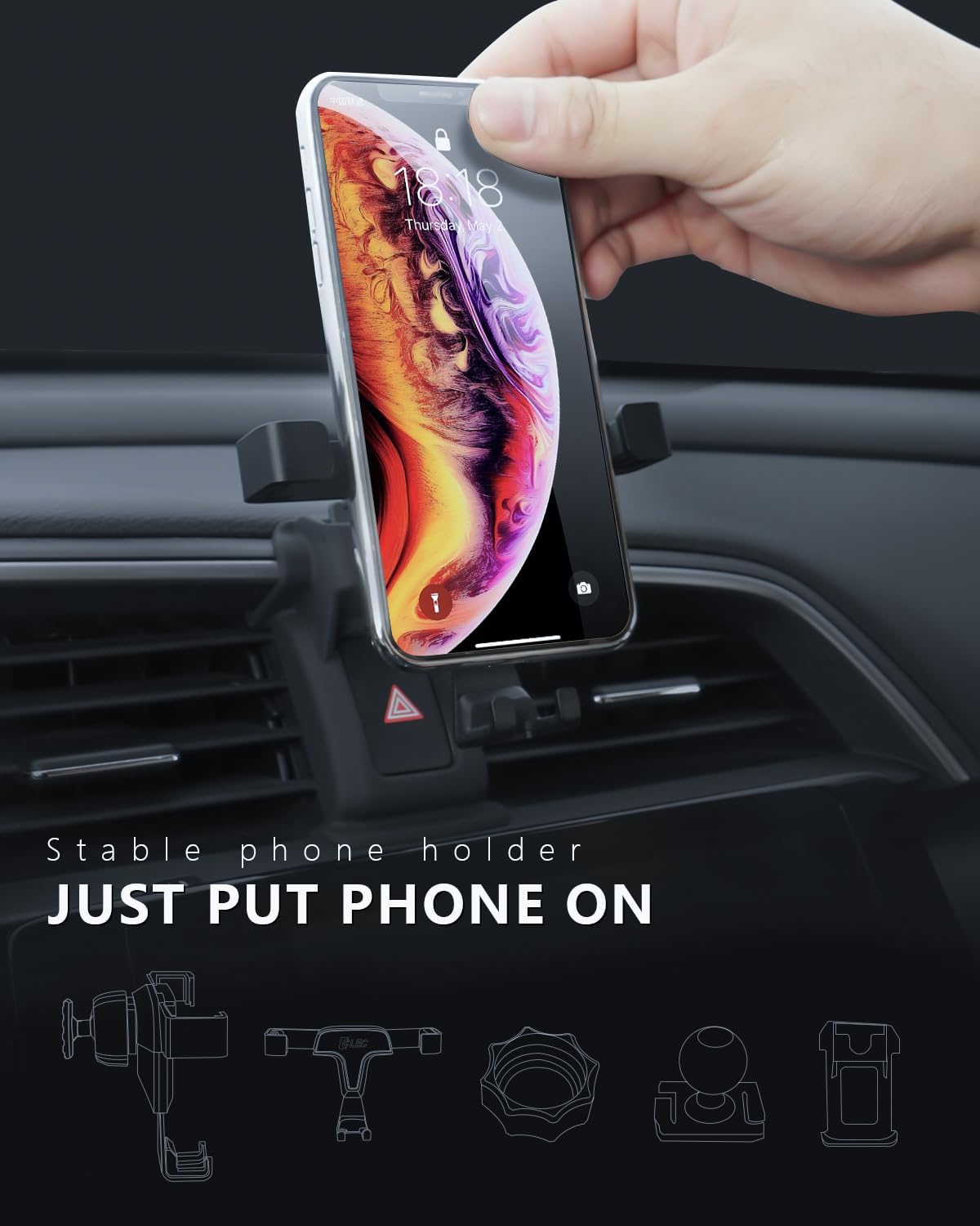 HANDS DOWN BEST PHONE HOLDER ON THE MARKET. I have tried a variety of other brands and none of them compare. it clips into the vent – but not the way phone mounts usually do where they grab the vertical bar on the vent. This one has four clips on the base which essentially snap in over a blank spot in between your two center mounted vents. has never fallen out although I drive on some really awful roads and removing the phone is easy since gravity holds it in. (you dont need to squeeze or click any buttons to release like most mounts require you to)