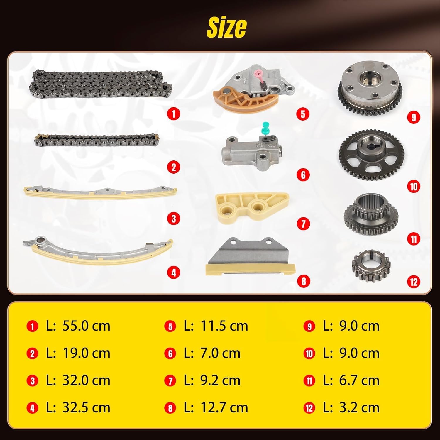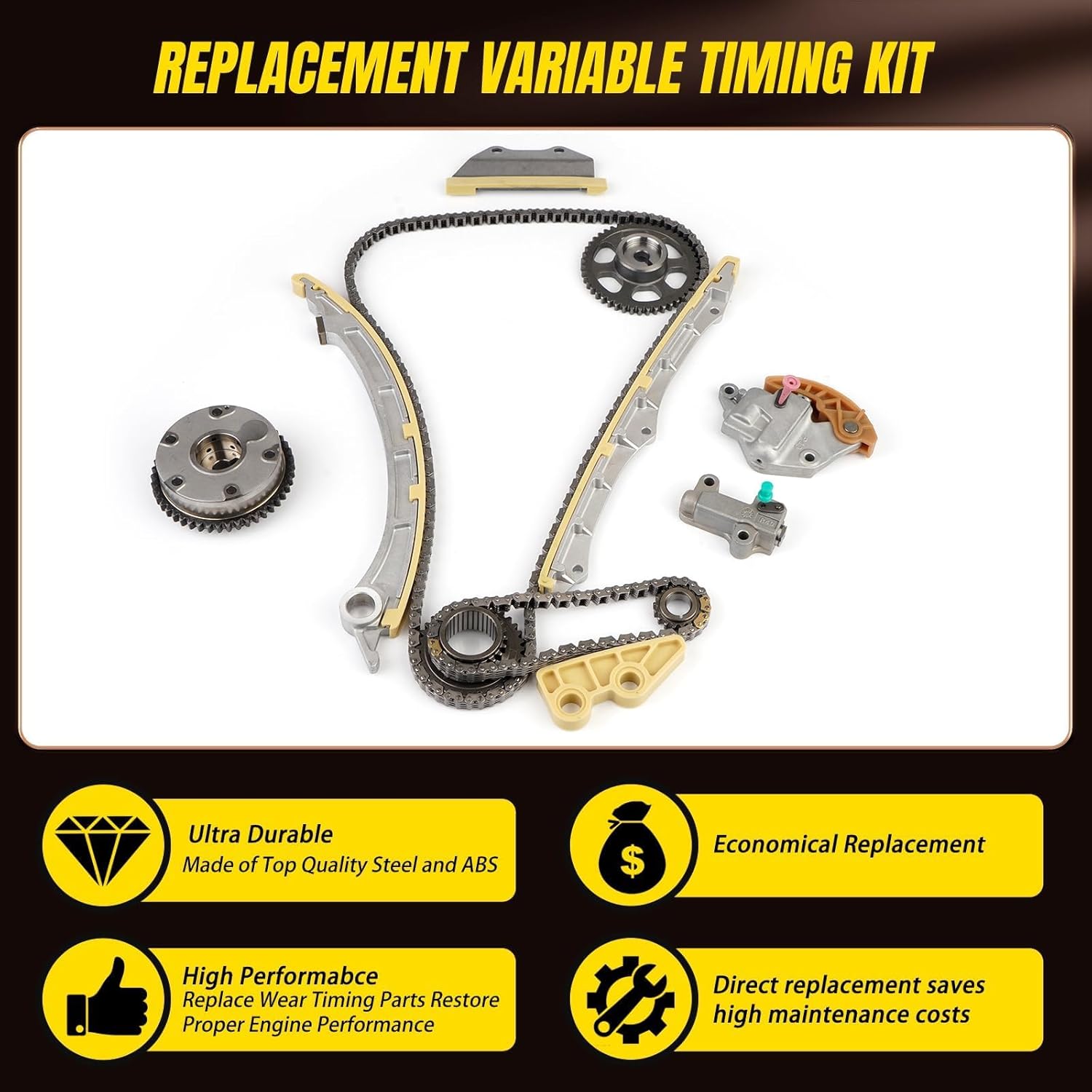 - Alta Qualidade: Fabricado em aço de alta qualidade e ligas resistentes ao desgaste, o nosso Kit de Corrente de Distribuição garante uma transferência de potência confiável e um desempenho duradouro. O guia de corrente de precisão assegura uma operação suave e silenciosa, minimizando o desgaste.