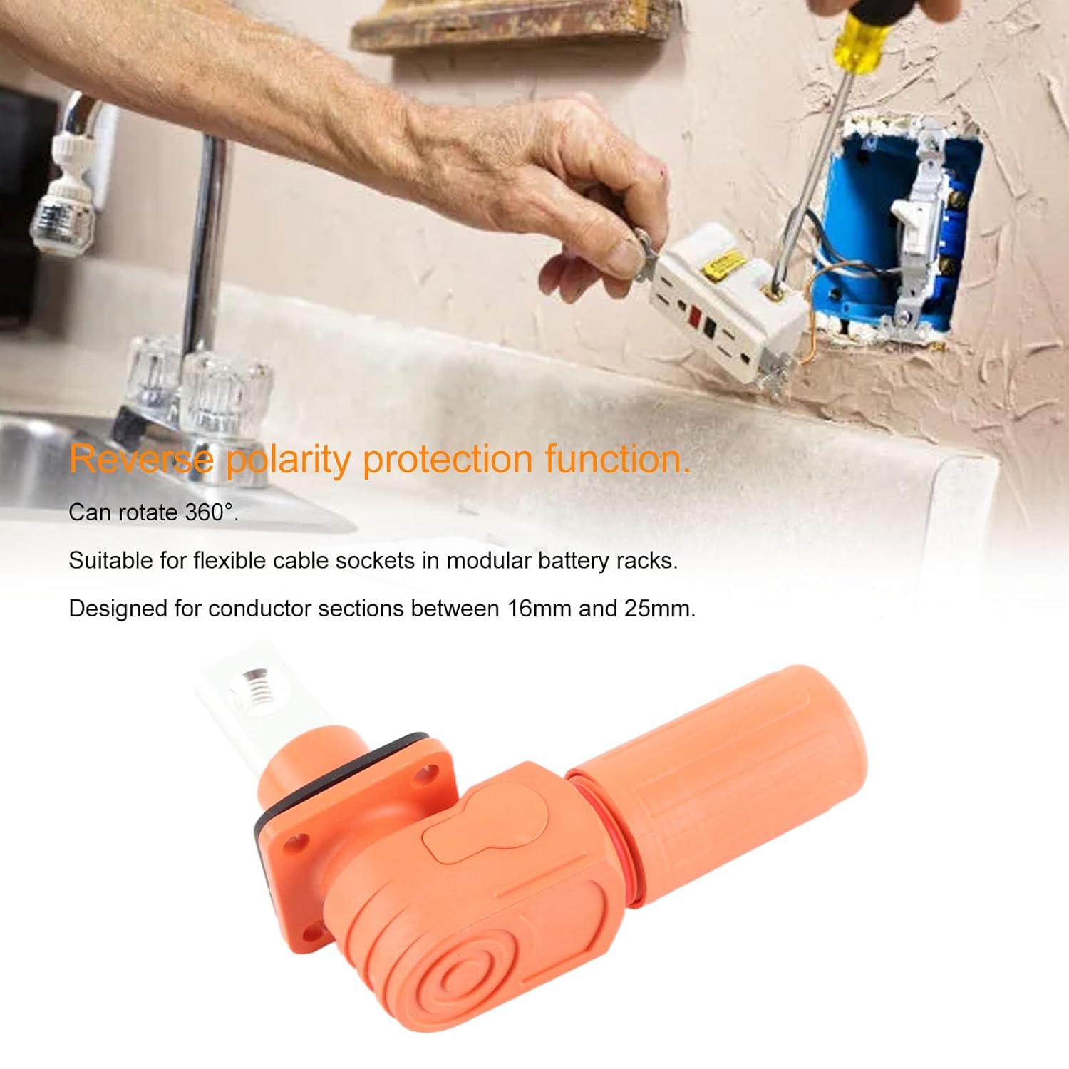 - Conector Flexível: Equipado com proteção contra polaridade reversa e capacidade de rotação de 360°, o conector se adapta facilmente a diferentes configurações de instalação, facilitando o trabalho em espaços limitados.
