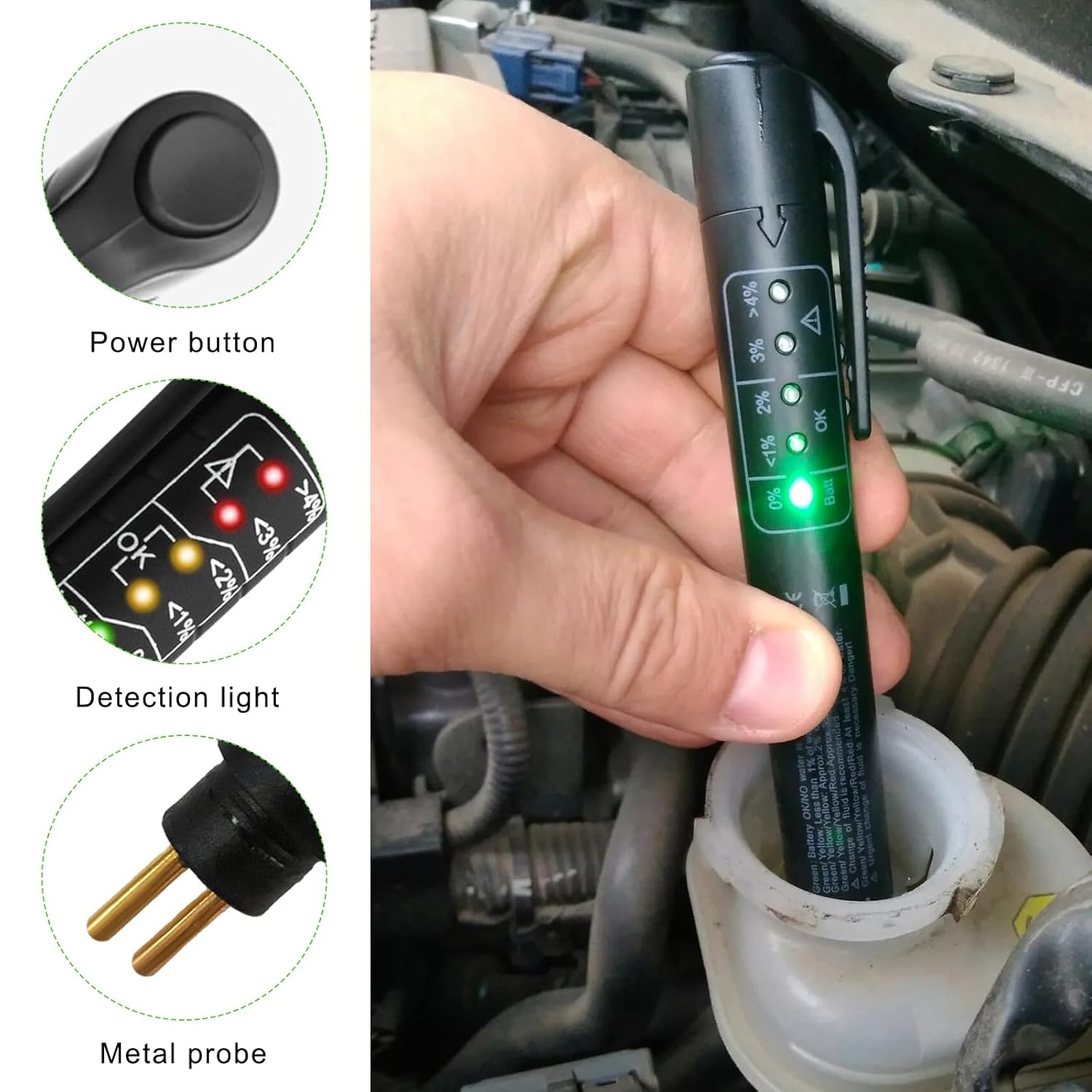 – Fácil de Usar: Basta pressionar o botão de energia e a luz LED verde acenderá. Após um breve momento, insira a sonda no fluido de freio e as luzes LED se iluminarão com base no nível de água detectado. Assim que o teste for concluído, o dispositivo desliga automaticamente em 12 segundos.