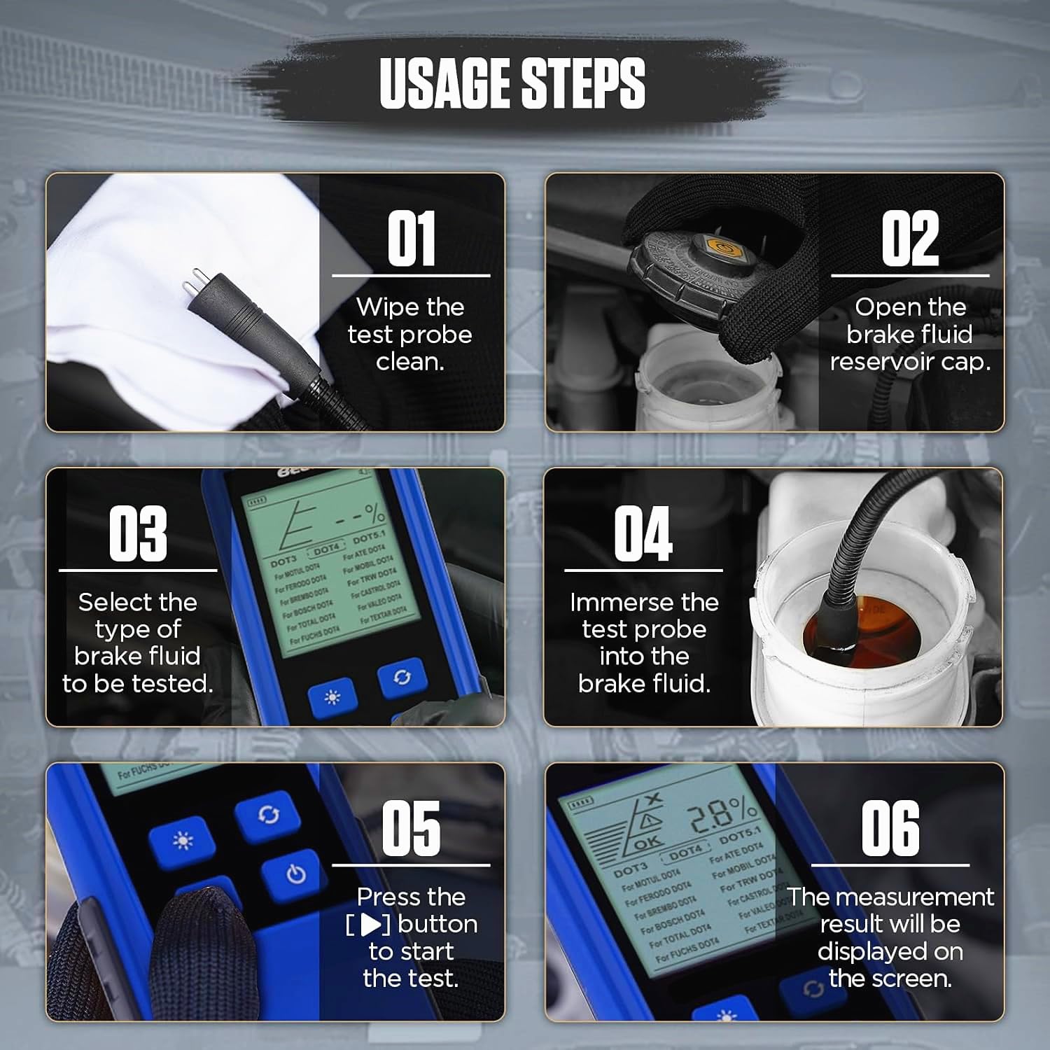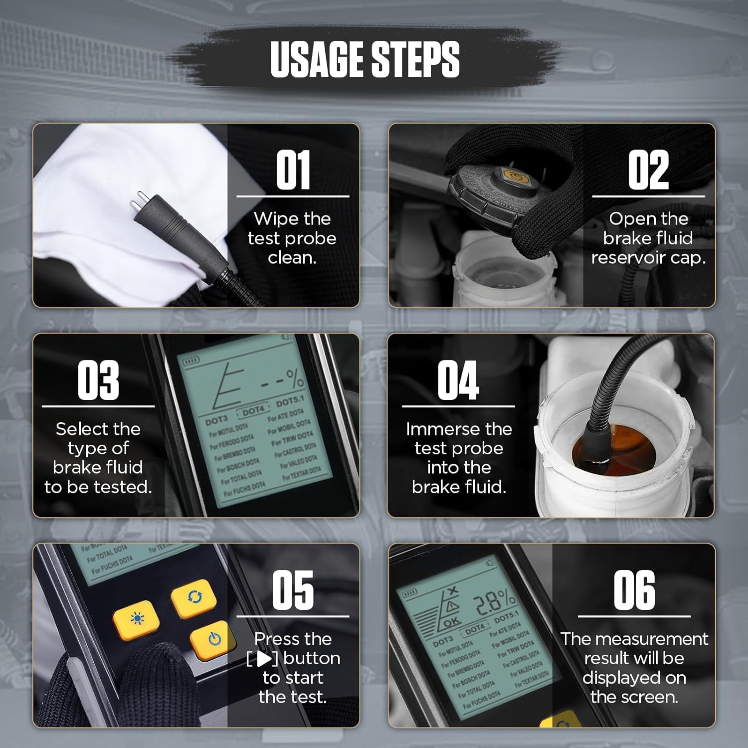 The tool requires 4 AAA batteries (included). The tool itself is simple to use. Make sure the probe is dried off. Set the mode to the correct fluid Type (DOT-3, DOT-4, DOT-5.1, etc). You can also set it to a number of specialized fluids. Once set, simply submerge the probe into the fluid and press the play button. After 10-20 seconds the readout will provide the moisture percentage, along with a symbol indicating whether it is OK, needs attention, or needs to be replaced.