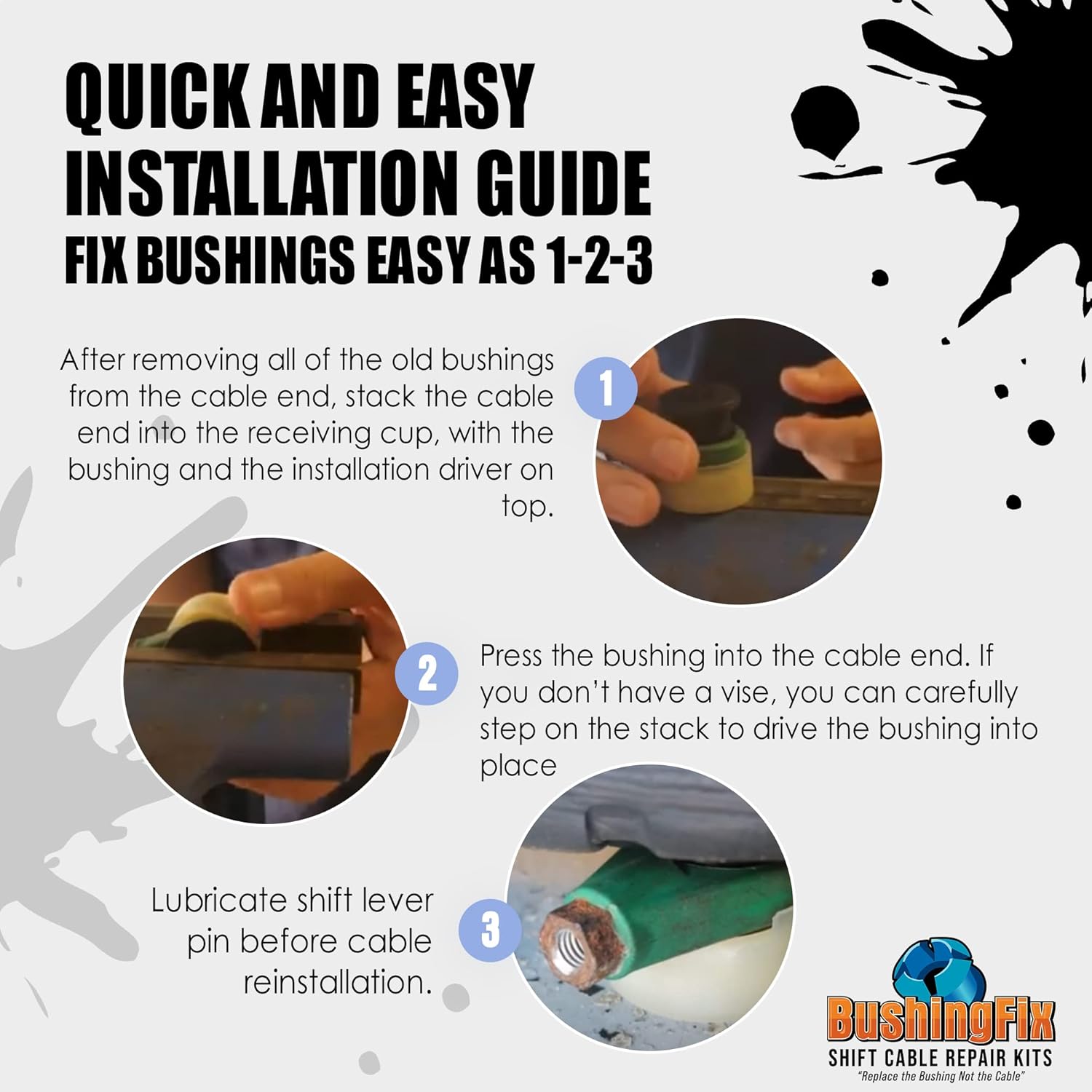 O BushingFix NA1Kit é um kit de substituição tudo-em-um, que vem com duas buchas de reposição, um pacote de graxa e ferramentas de instalação. Isso significa que você pode reparar o cabo de mudança da sua transmissão manual sem complicações. A BushingFix se orgulha de ser membro da Automatic Transmission Rebuilders Association e garante que seu kit de reparo de buchas passou por rigorosos testes de qualidade para assegurar a ausência de defeitos de material ou produção.