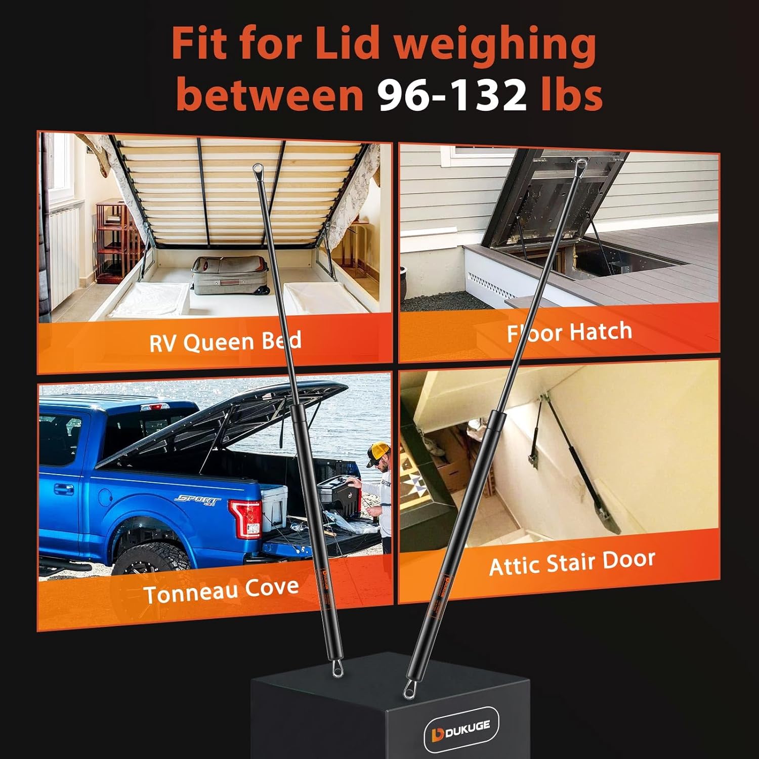 – Aplicações Comuns: Ideal para tampas de tonneau de caminhões, camas de RV, portas de acesso ao sótão, tampas de lixeiras e outras aplicações DIY, ajudando a levantar coberturas com uma pressão de 96 a 132 lb.