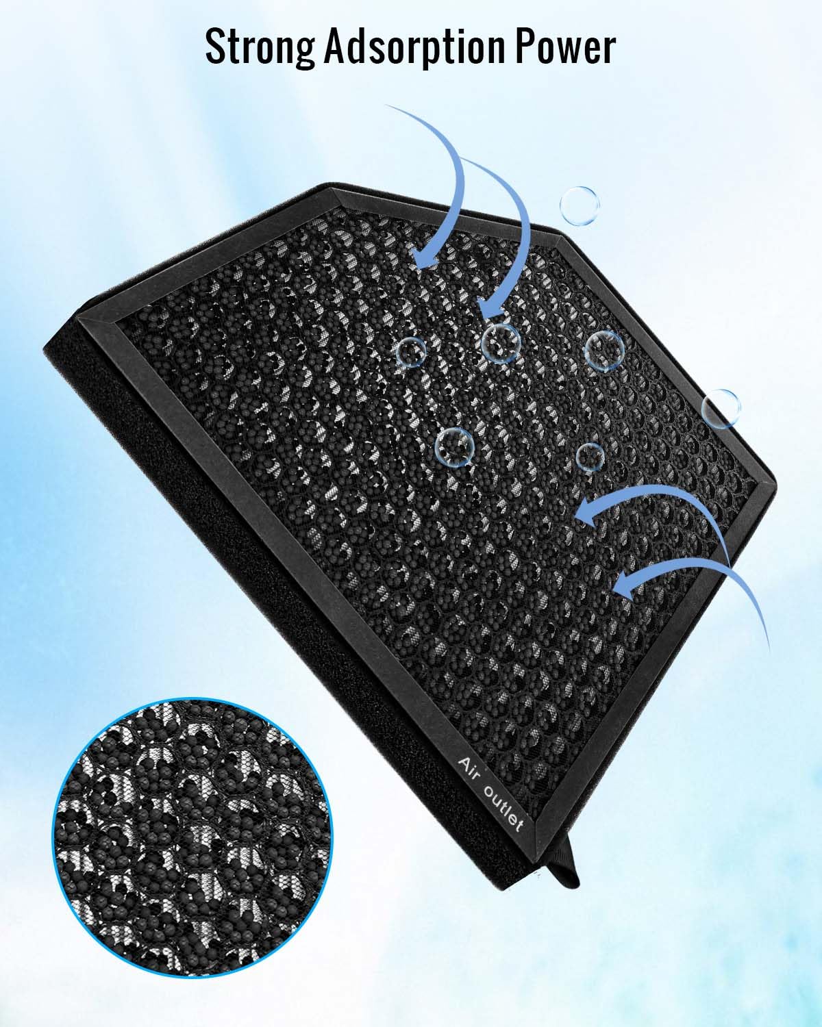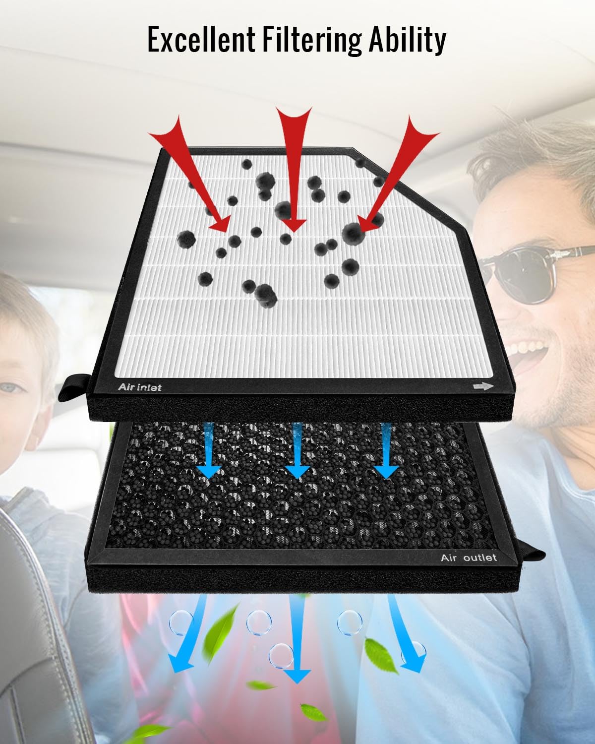 • Forte Poder de Adsorção: A parte traseira do filtro é totalmente coberta com carvão ativado, que possui um forte poder de adsorção, capaz de absorver odores dentro do carro, mantendo o ar limpo e permitindo que você respire um ar seguro e confortável.