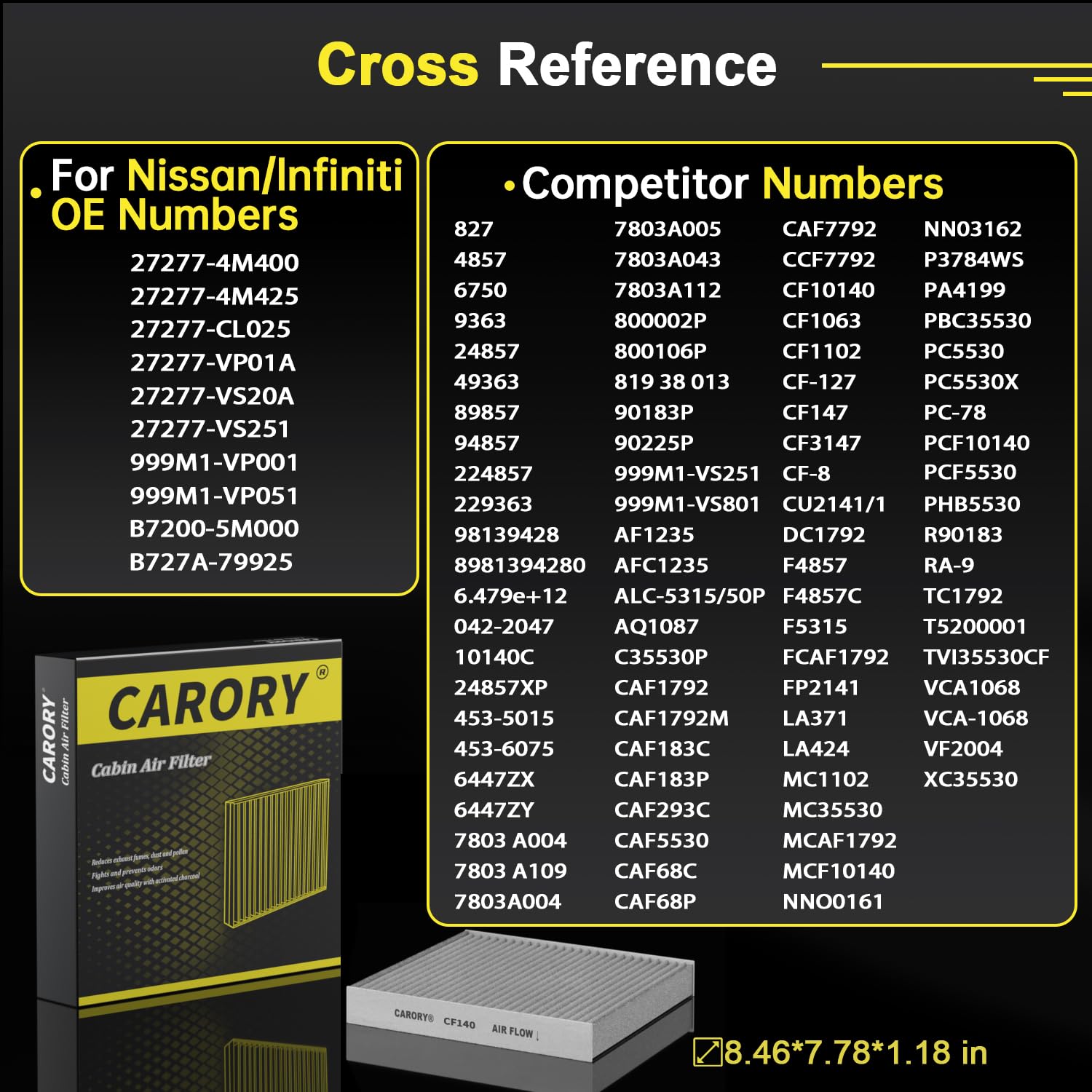 This high-quality cabin air filter is designed to improve air quality in your vehicle by effectively trapping dust, pollen, and other airborne particles. With an activated carbon layer, it also helps reduce odors and harmful pollutants, ensuring a fresher and healthier driving experience. Compatible with a wide range of Nissan, INFINITI, and Mitsubishi models from 2002 to 2024, this filter offers an easy and affordable upgrade for better cabin air.
