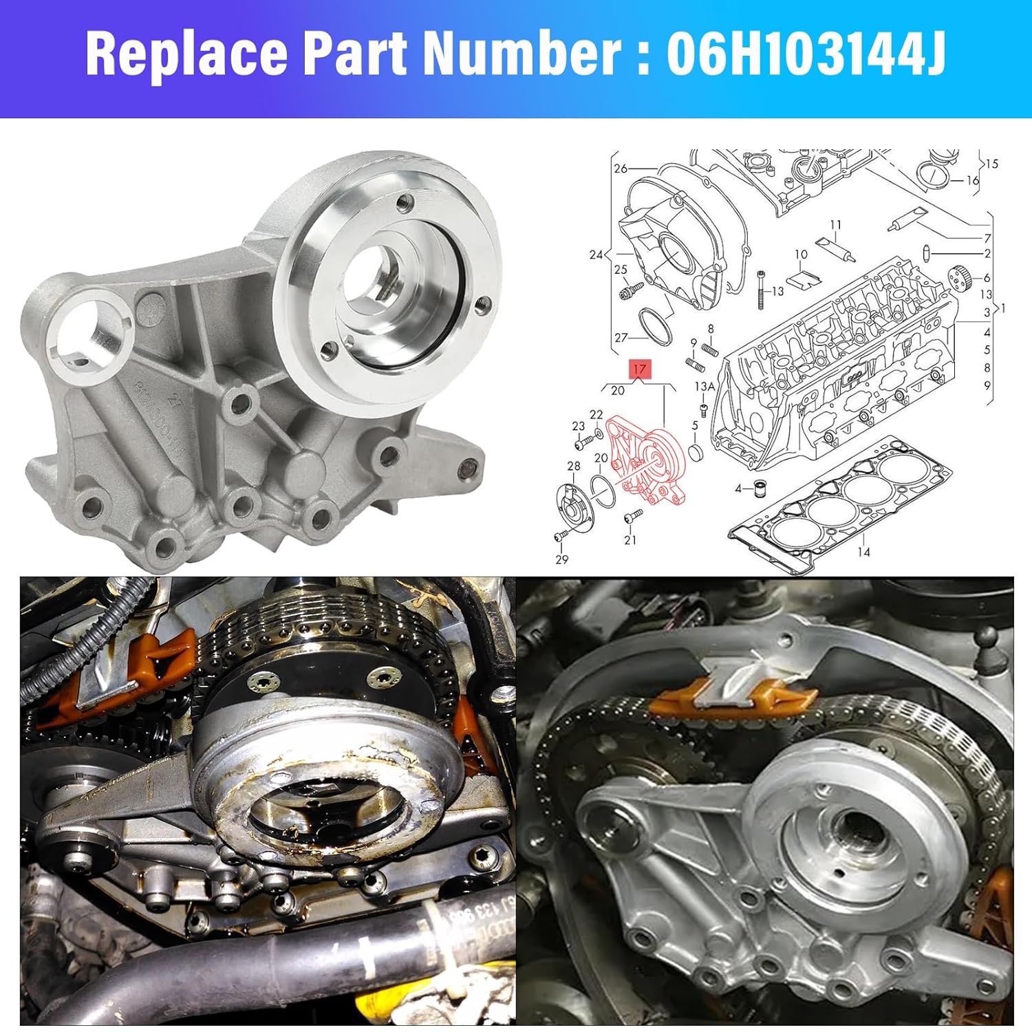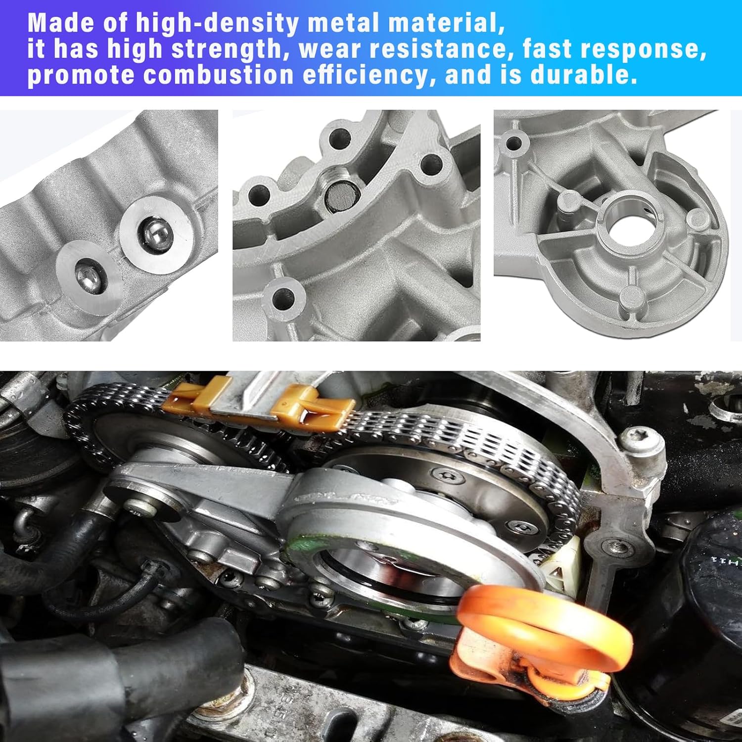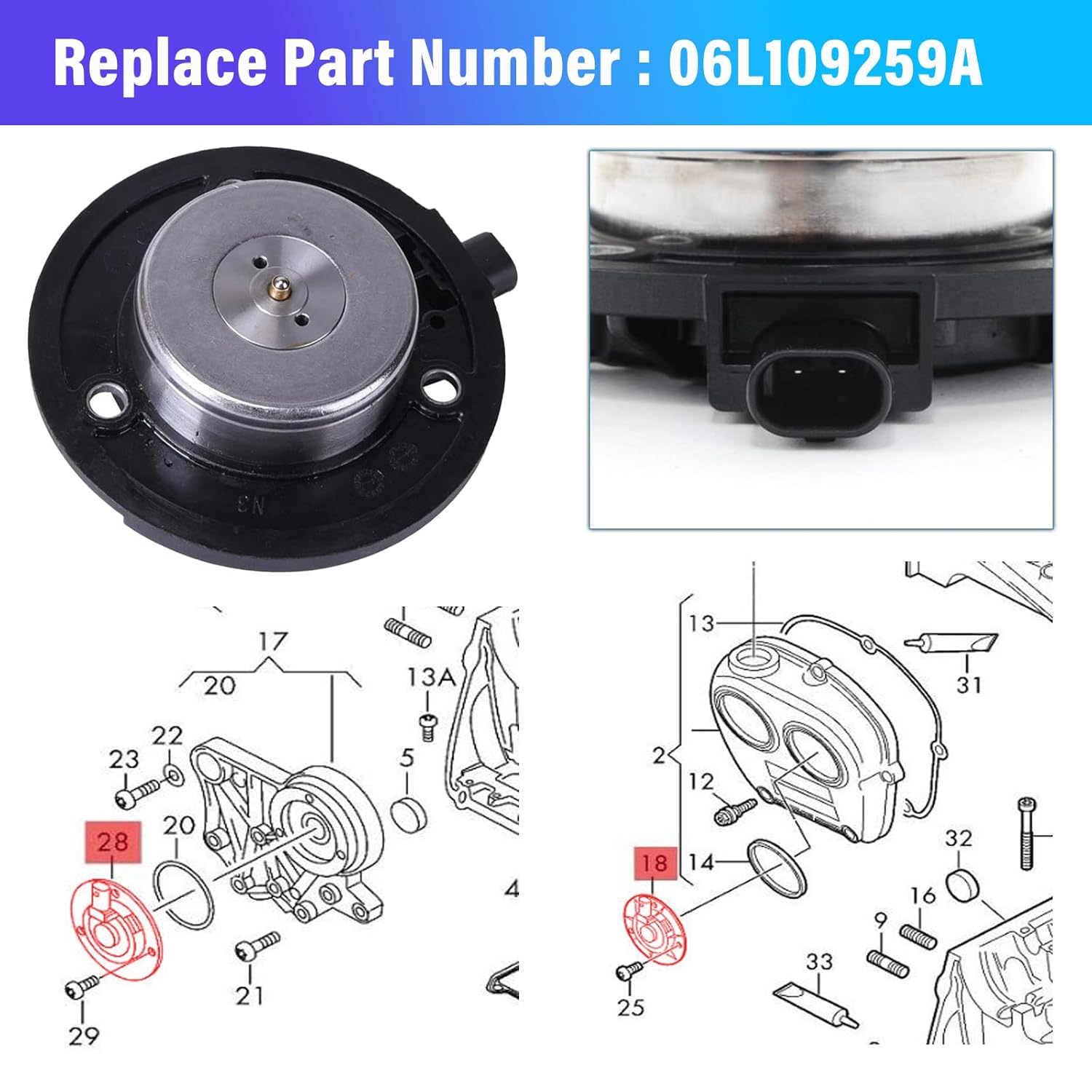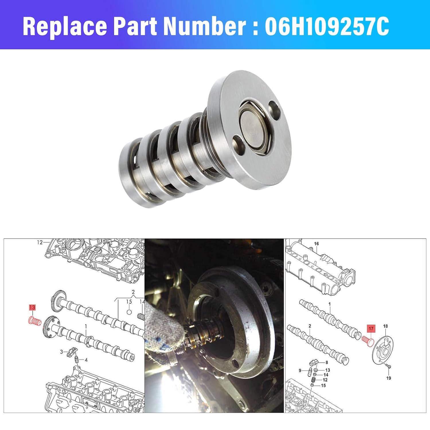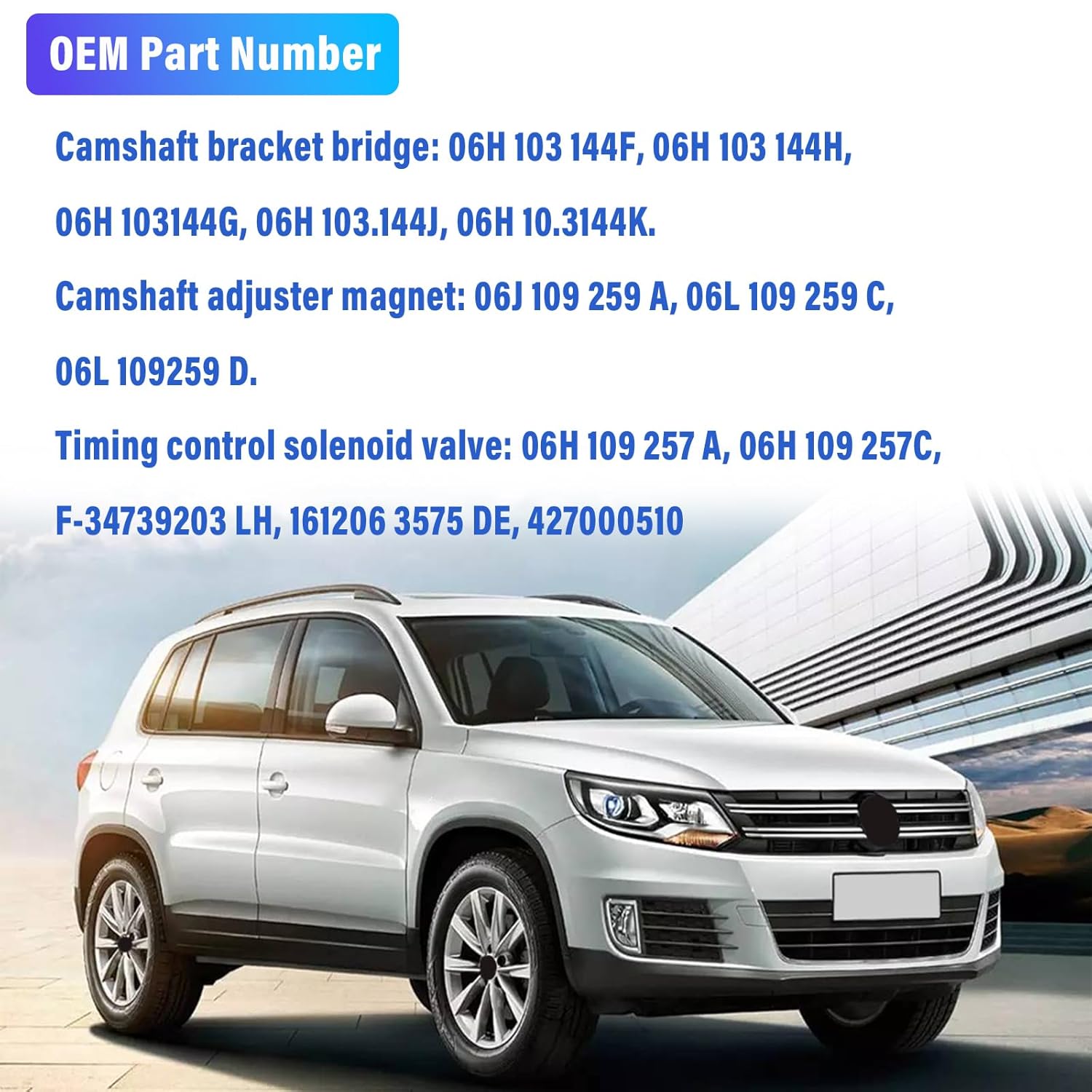 Os suportes de bucha do eixo de comando são compatíveis com os números de peça 06H 103 144F, 06H 103 144H, 06H 103 144G, 06H 103 144J, 06H 103 144K. O ímã do ajustador do eixo de comando é compatível com 06J 109 259 A, 06L 109 259 C, 06L 109259 D. O solenoide de controle de tempo é compatível com 06H 109 257 A, 06H 109 257C, F-34739203 LH, 161206 3575 DE, 427000510.