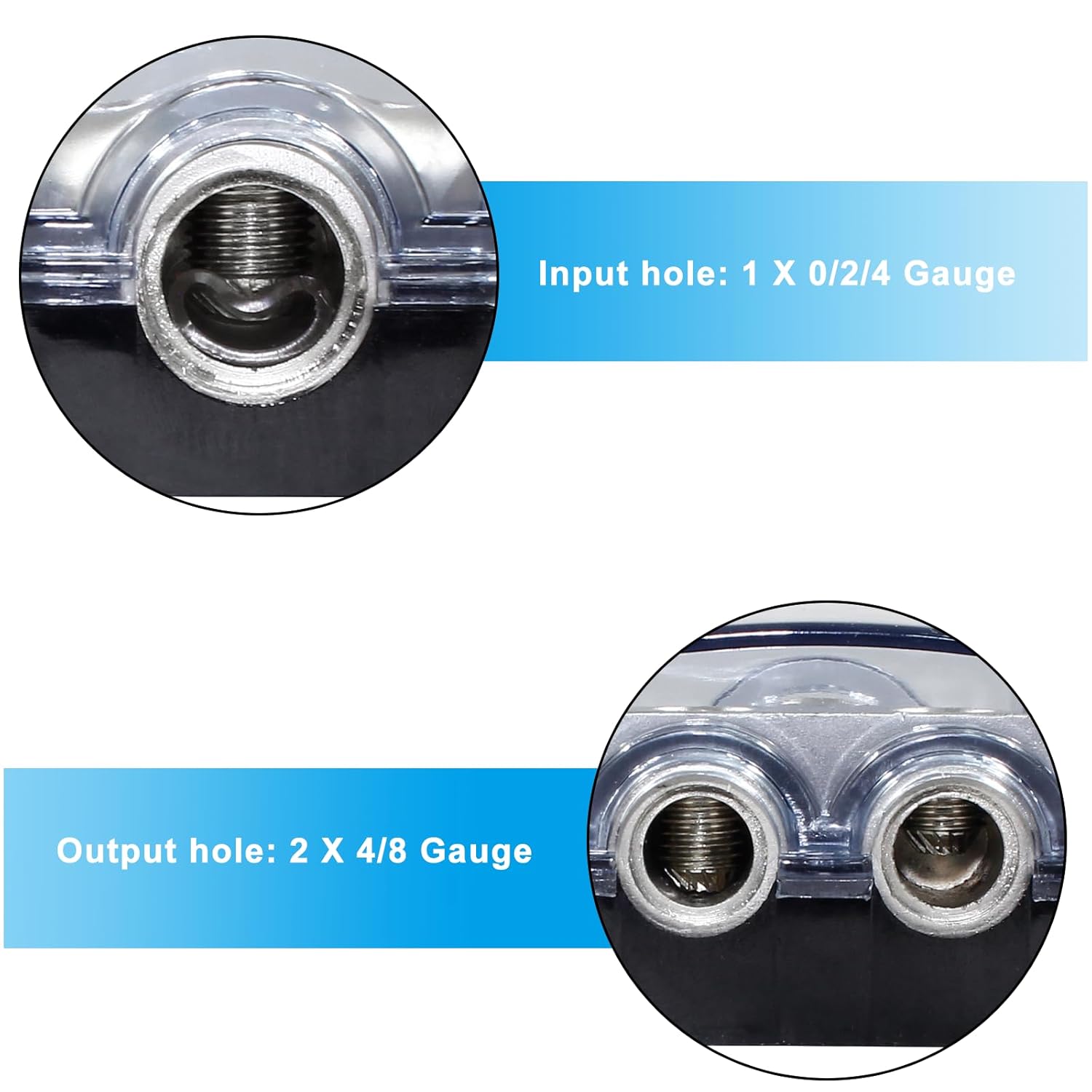 This 2 Way Ground Distribution Block works great and looks amazing. The inputs are true to size, I used a 4 gauge in and a 4/8 gauge out.