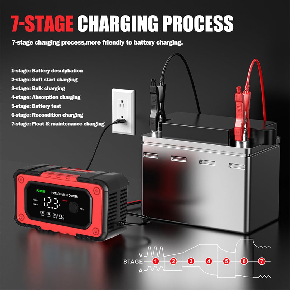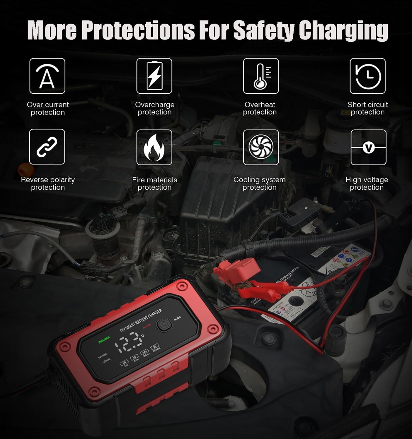 Mais do que um simples carregador, este dispositivo atua como mantenedor, desulfatador e carregador flutuante em um só. Ele detecta automaticamente a saúde da bateria e ajusta seu processo para otimizar o desempenho, prolongando a vida útil da bateria e garantindo partidas perfeitas do motor. Nota: Não é um iniciador de emergência; ele ajuda a carregar e manter baterias com baixa voltagem ou que ficaram inativas por longos períodos.