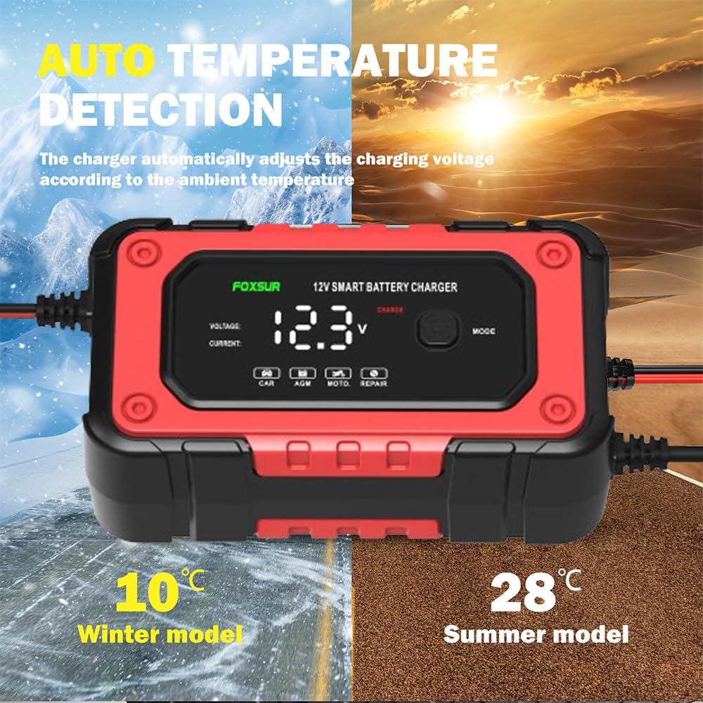 Mantenha-se informado com a tela LCD grande e retroiluminada que exibe o status de carregamento em tempo real, corrente, voltagem e porcentagem. A interface intuitiva orienta você em cada etapa, tornando a gestão da bateria uma tarefa simples. O carregador automático possui um sensor térmico integrado que detecta a temperatura ambiente para evitar sobrecarga ou subcarga em verões quentes ou invernos frios.
