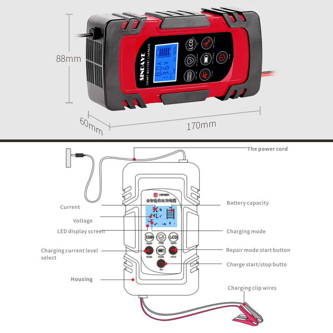 Nota: Este carregador é projetado para baterias com capacidade entre 120AH e 150AH. Verifique a capacidade (AH) da sua bateria antes de adquirir o carregador!