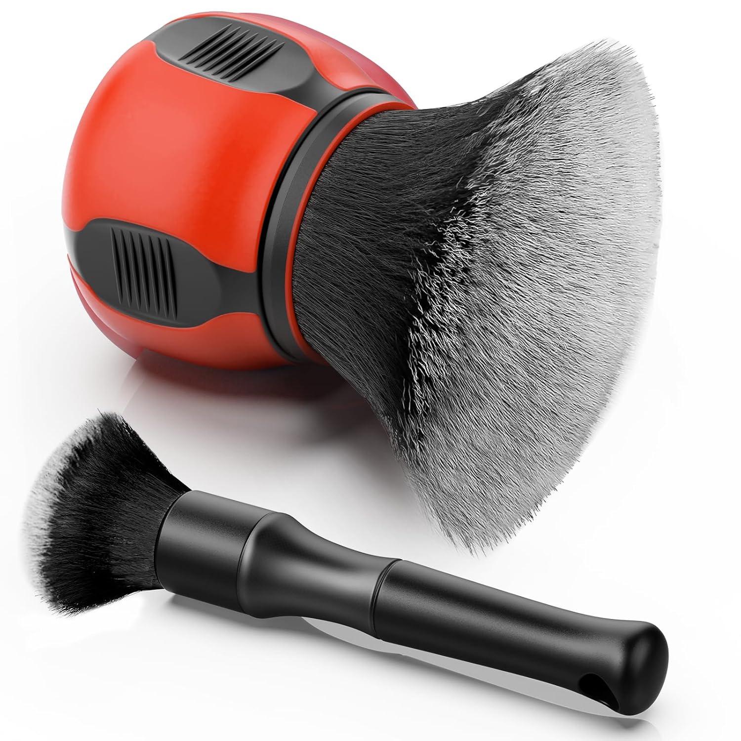 These are very soft brushes, and will treat the interior surfaces of your care with great care. I would even consider using the smaller one to dust off fine camera optics. The smaller brush is very useful for tight spaces, like AC vents, and the little crannies between controls. The large brush is great for dusting off larger surfaces. The large brush came with a plastic stand that can either be wall mounted, or can sit on a shelf or countertop… the stand keeps the bristles from making contact from those surfaces, keeping the clean and in their proper shape. The handles on both brushes feel good in the hand.