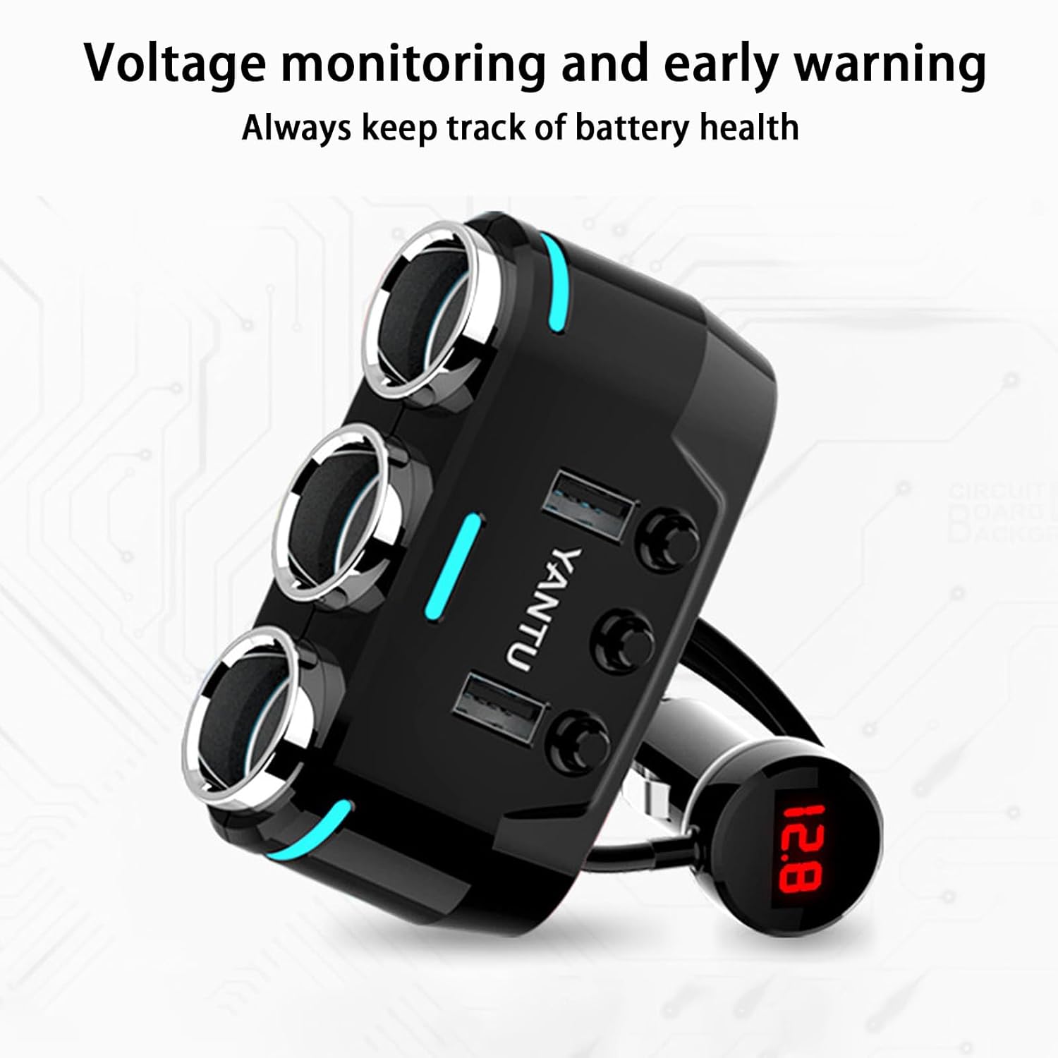O voltímetro LED embutido monitora ativamente a saúde da bateria do seu carro, exibindo a voltagem enquanto o motor está em funcionamento. Se a voltagem cair abaixo de 12V, o voltímetro piscará, alertando-o sobre possíveis problemas antes que se tornem críticos.