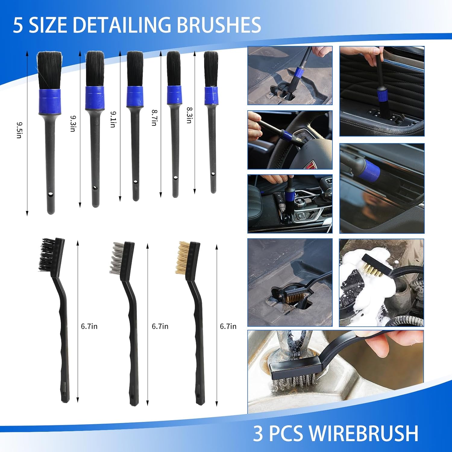 Com cinco escovas de detalhamento e três escovas de arame em tamanhos variados, este kit atende a todas as suas necessidades de limpeza, desde pequenas fendas e cantos até porcas de roda, rodas, saídas de ar, bancos de carro, compartimentos do motor, painéis e muito mais. As escovas de arame incluem uma escova de aço inoxidável, uma escova de latão e uma escova de nylon, permitindo que você escolha o material adequado para cada superfície.