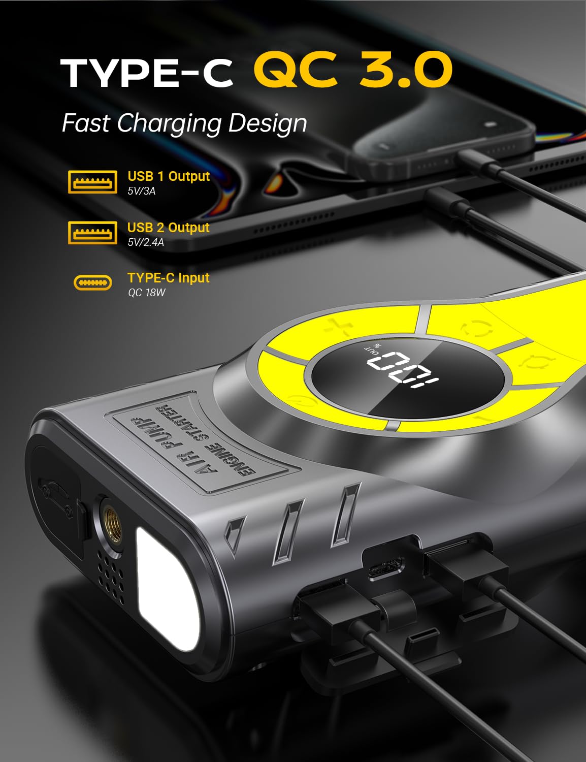 As a bonus, the device doubles as a portable charger with its QC3.0 feature, allowing me to charge my phone on the go. This makes it perfect for road trips or emergencies. The built-in LED light is also a handy touch, providing extra visibility at night or in low-light situations.