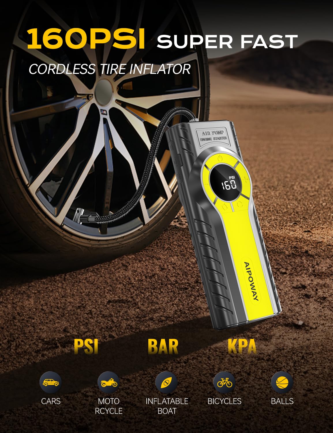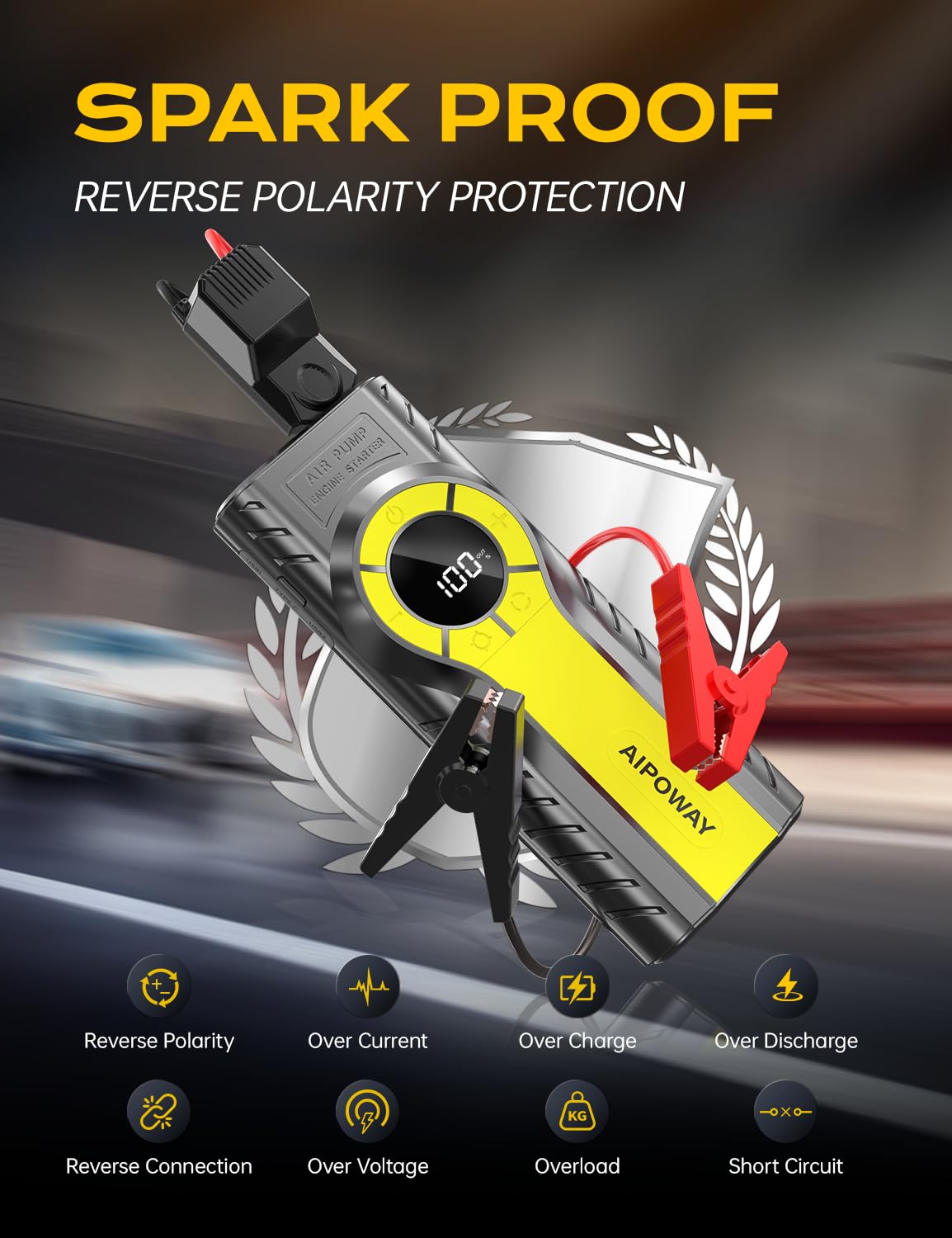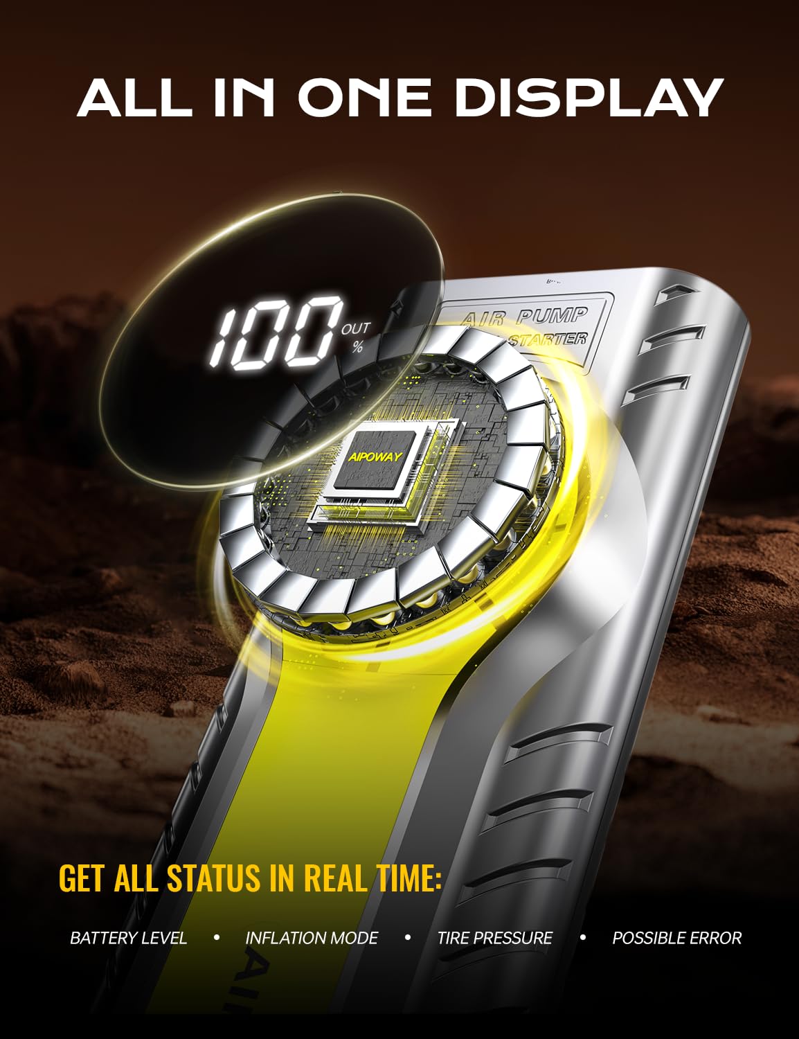 O AIPOWAY combina sete funções essenciais: partida de emergência, inflador de pneus, iluminação, sinalização SOS, carregamento de dispositivos móveis, tecnologia de armazenamento de energia e carregamento rápido. O display inteligente exibe todas as funções em uso, tornando a operação simples e intuitiva. Com uma bateria de 26800mAh, este jump starter é leve e fácil de transportar, ideal para qualquer situação.