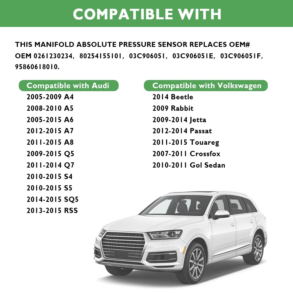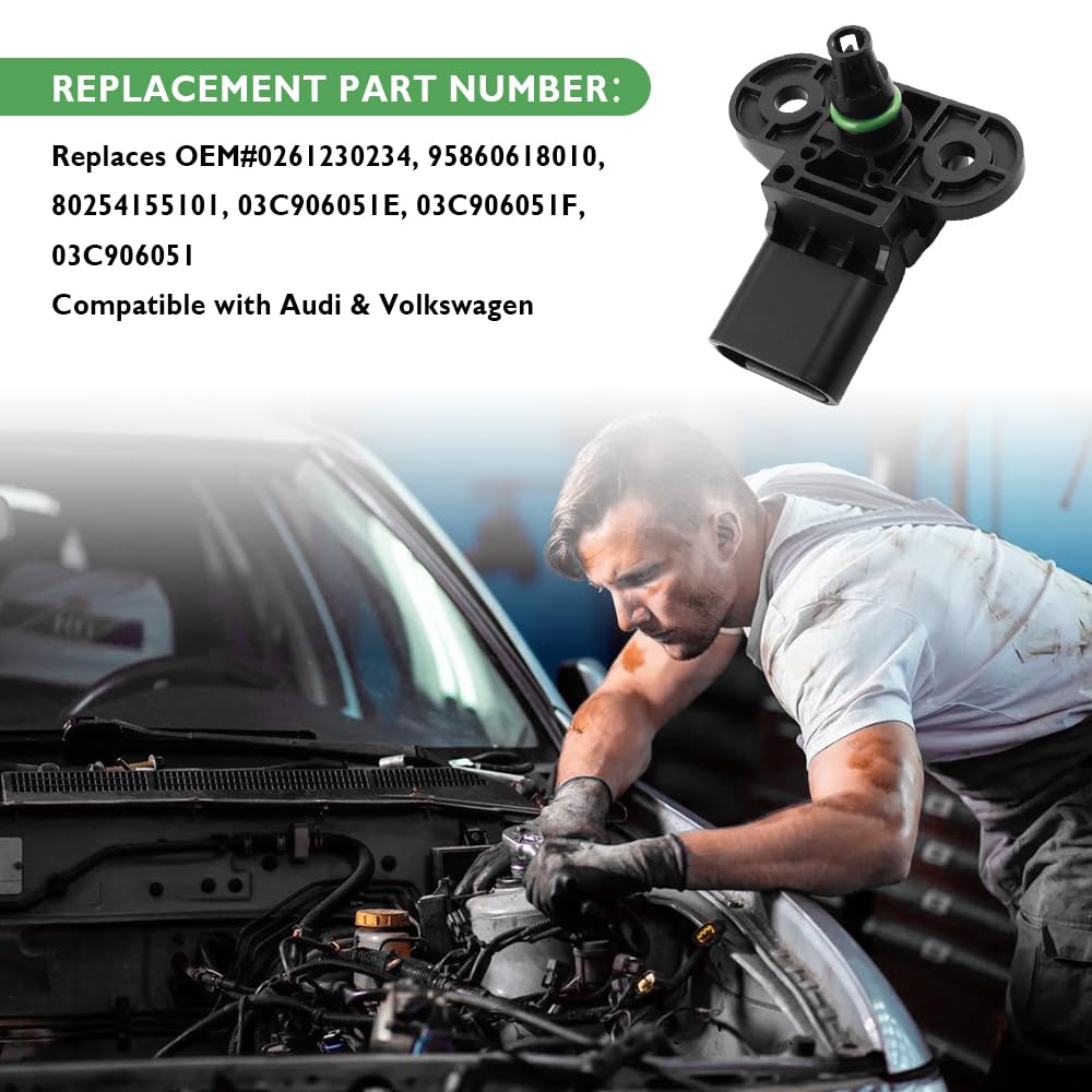 O Sensor de Pressão Absoluta do Coletor é uma peça fundamental para o desempenho do seu veículo, especialmente se você possui um Audi ou Volkswagen. Este sensor substitui os números de peça OEM#0261230234, 95860618010, 80254155101, 03C906051E, 03C906051F, 03C906051, garantindo uma compatibilidade perfeita com uma variedade de modelos. Produzido com precisão em uma base 1:1 em relação ao original, este sensor é projetado para atender às especificações exatas do seu carro. Antes de realizar a compra, verifique cuidadosamente o número OEM/modelo para garantir que o sensor de pressão é o que você precisa.
