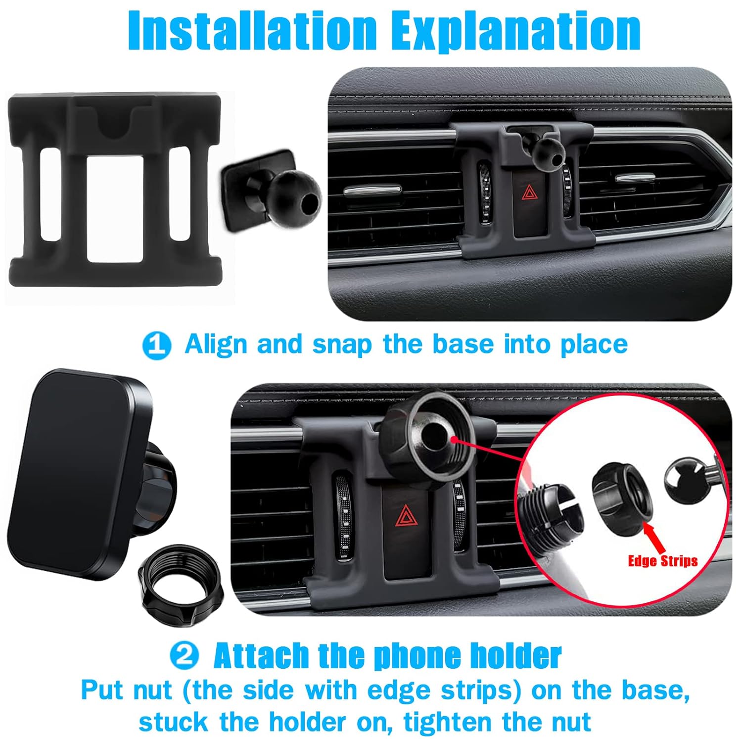 This is an amazing little phone holder for my Mazda 2021 Cx5. It snapped into place and leaves my vent dials and hazard warning button exposed so I can use them when needed. I ran over rough road just to check out the holding power and no problems. My phone held fine and the book on tape i was listening to did not skip. Great holder and great value.