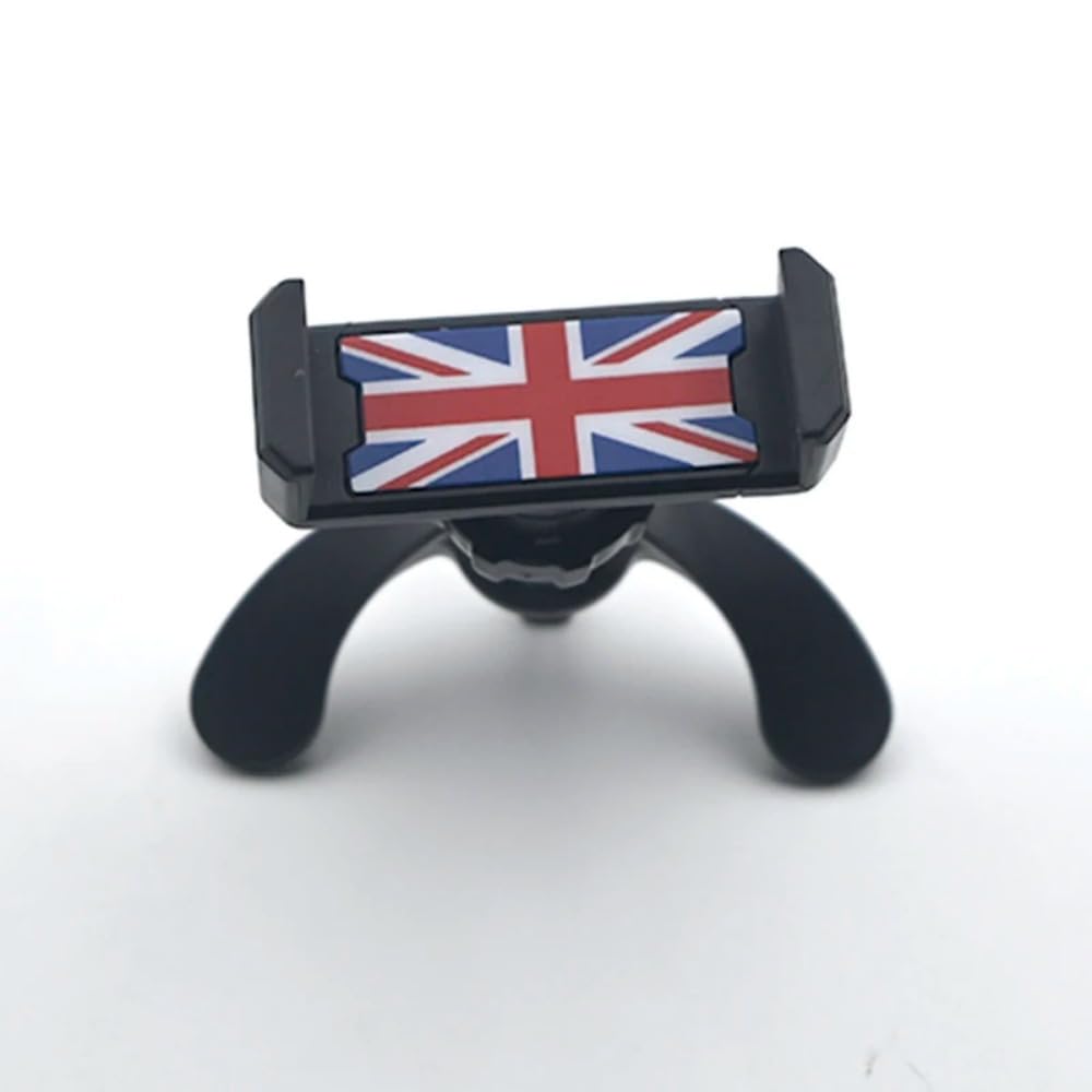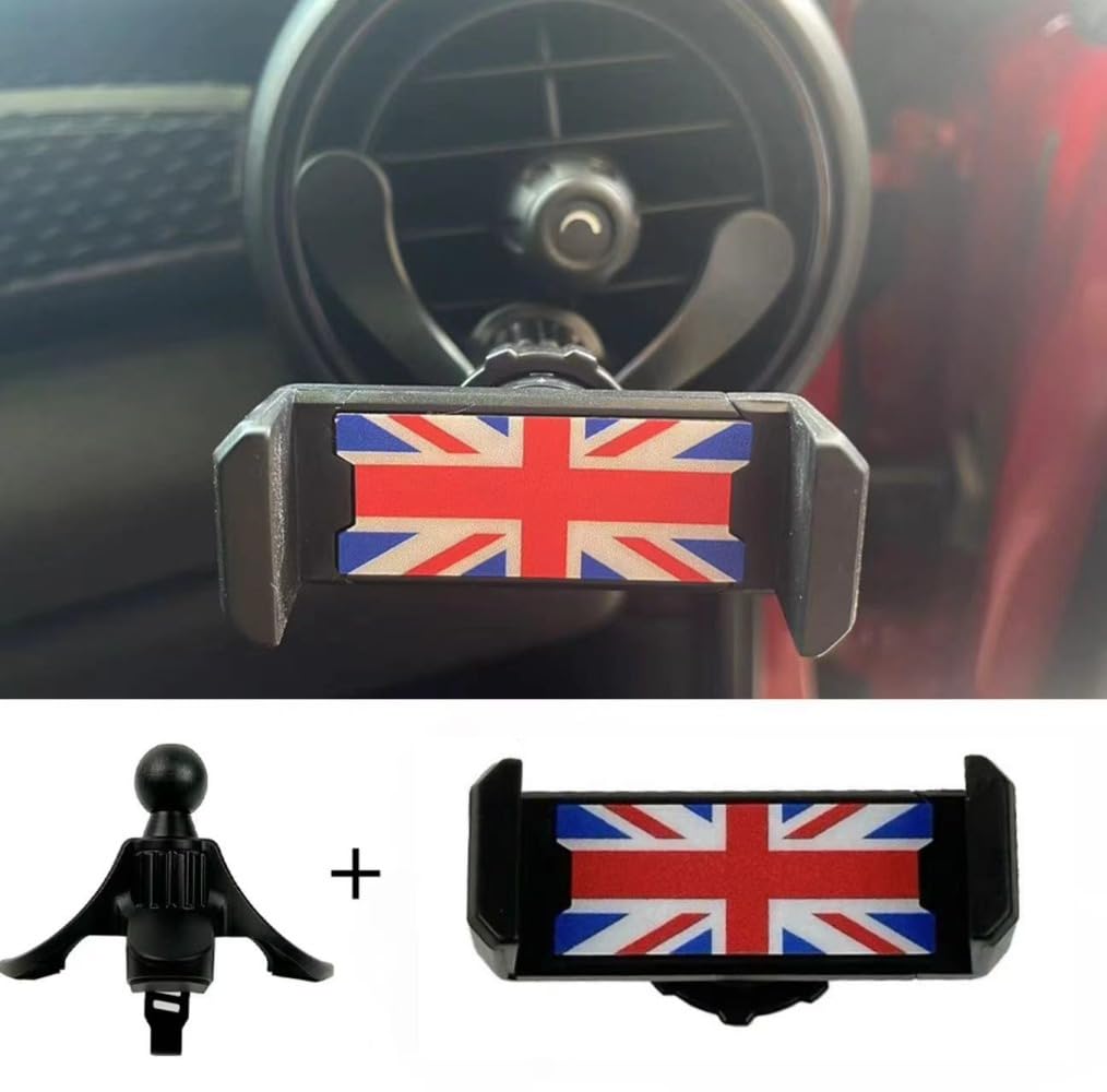 Suporte para celular para carro com design da bandeira do Reino Unido, ideal para o Mini Cooper R-Series. Montagem circular para ventilação, garantindo fácil acesso ao smartphone. Permite uso mãos-livres, proporcionando segurança e conforto durante a condução. Compatível com iPhones e outros smartphones, é prático e estiloso, adicionando um toque de personalidade ao interior do veículo.