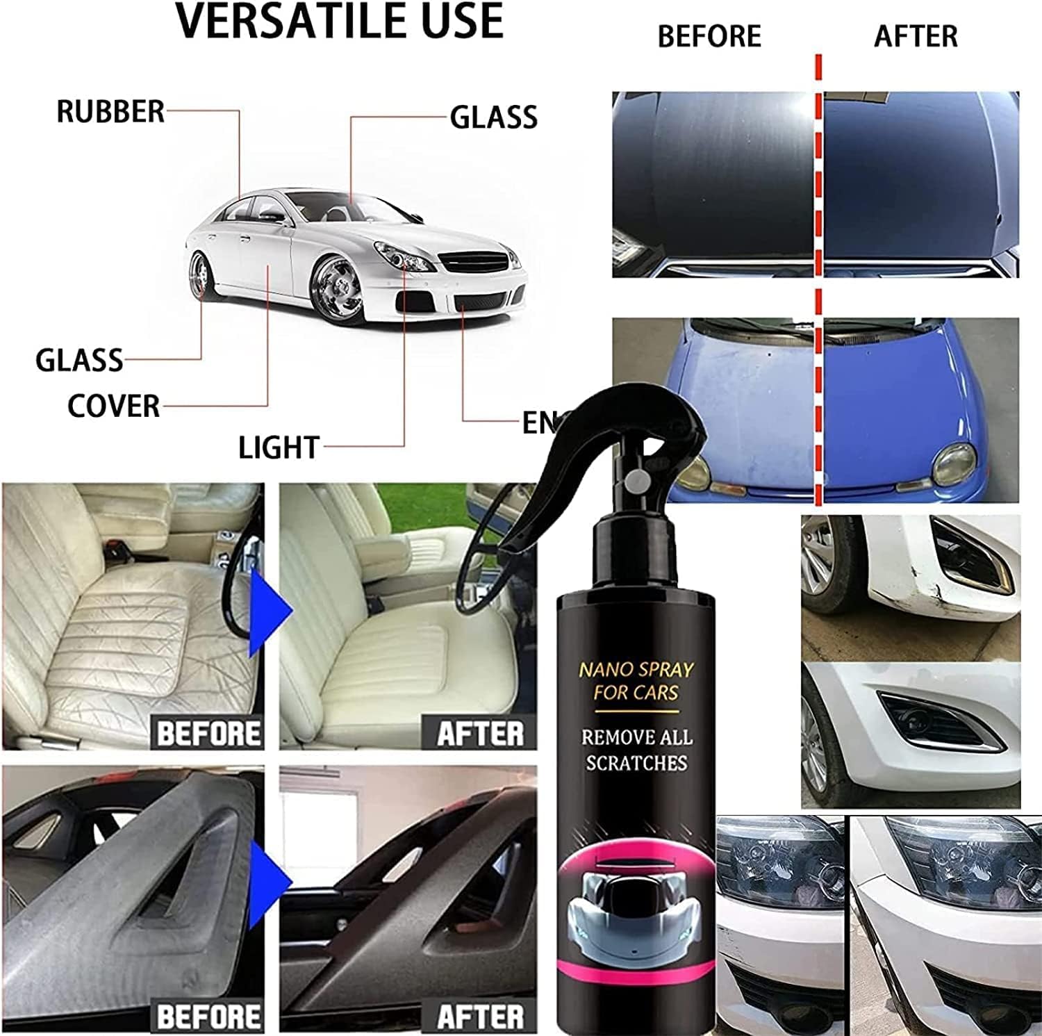 A tecnologia de revestimento nano cria uma camada hidrofóbica que impede que poeira e líquidos se fixem na superfície do carro, facilitando a limpeza e manutenção. O resultado é um acabamento brilhante e lustroso, sem a necessidade de cera, que se adapta a diversas superfícies, incluindo molduras de carroceria, plásticos, pneus e muito mais. Além disso, o Car Scratch Quick Repair Nano Spray é versátil, podendo ser misturado com qualquer cor de tinta automotiva e aplicável em uma variedade de materiais, como rodas, cromados, metais, plásticos, borrachas, couro, motores e até carpetes.