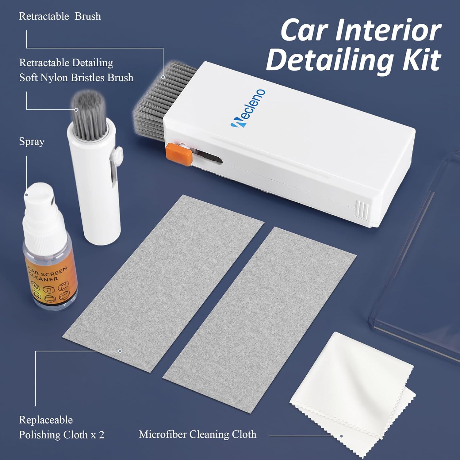 – MULTI-PURPOSE CAR SCREEN CLEANER: O kit de limpeza para interiores de carro inclui uma escova grande retrátil, uma escova de cerdas de nylon macias, dois panos de polimento removíveis e reutilizáveis, um spray eficaz para limpeza de telas e um grande pano de microfibra. Compacto e prático, o limpador de tela para carro é perfeito para ser armazenado no porta-luvas, facilitando o acesso e economizando espaço.