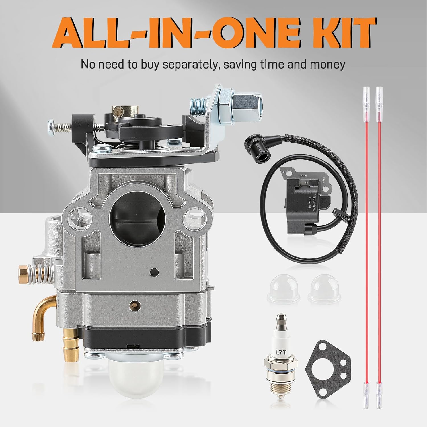 O pacote inclui tudo o que você precisa para uma instalação completa: 1 carburador, 1 bobina de ignição, 1 junta, 1 vela de ignição, 2 copos de óleo e 2 linhas de extinção, conforme ilustrado. Antes de realizar a compra, é fundamental comparar a peça antiga com as imagens do carburador para garantir que você está adquirindo o produto correto.