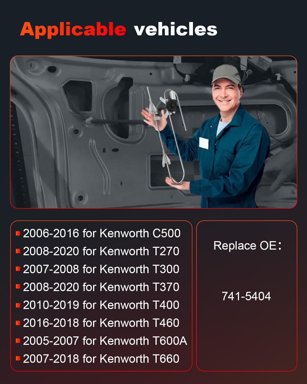 O regulador de janela elétrica CCIYU 741-5404 é a solução ideal para quem busca qualidade e eficiência na substituição do regulador de janela do lado do passageiro dianteiro do Kenworth T600A, fabricado entre 2005 e 2007. Este produto é projetado para se encaixar perfeitamente em uma variedade de modelos Kenworth, incluindo C500, T270, T300, T370, T400, T460, T660, T680, T800, T880, W900 e W990, abrangendo anos de 2005 a 2020.
