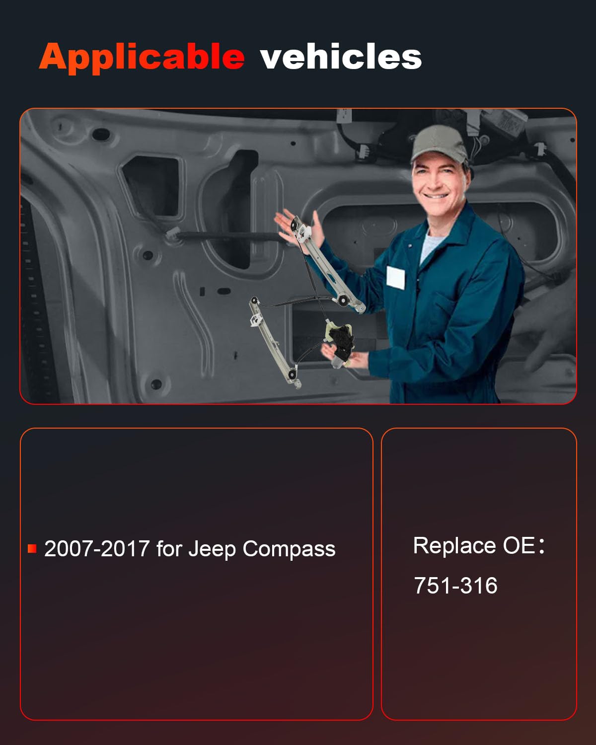 - Compatível com: 2007, 2008, 2009, 2010, 2011, 2012, 2013, 2014, 2015, 2016, 2017 para Jeep Compass. Substituição do regulador de janela com motor.