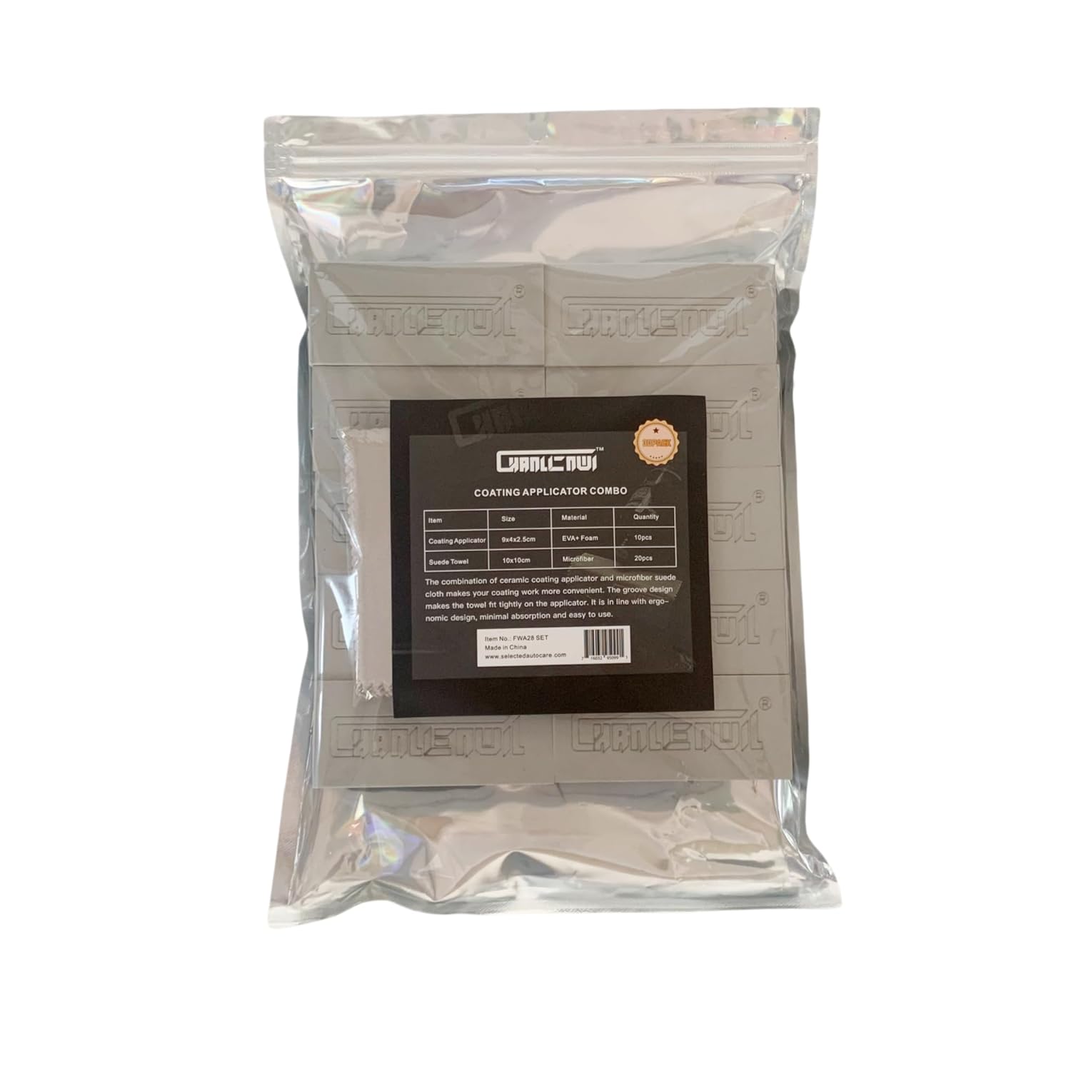 – Quantidade: 30 peças (10 aplicadores de espuma e 20 toalhas de camurça)