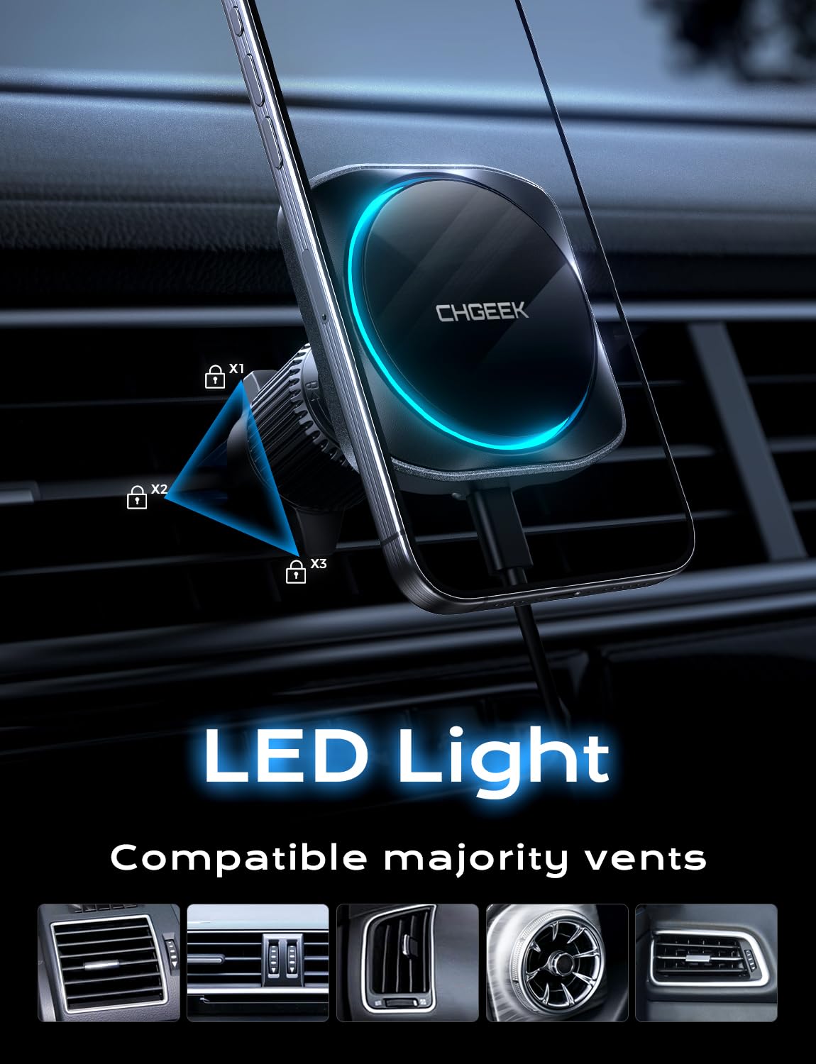 - Ventilador de Resfriamento Eficiente e Silencioso: O CHGeek Magsafe car mount possui um ventilador de resfriamento embutido e uma luz LED, que resolvem o problema de carregamento lento devido ao superaquecimento. Este carregador sem fio opera quase em silêncio, proporcionando uma iluminação ambiente aconchegante, ideal para suas necessidades de suporte para telefone no carro.