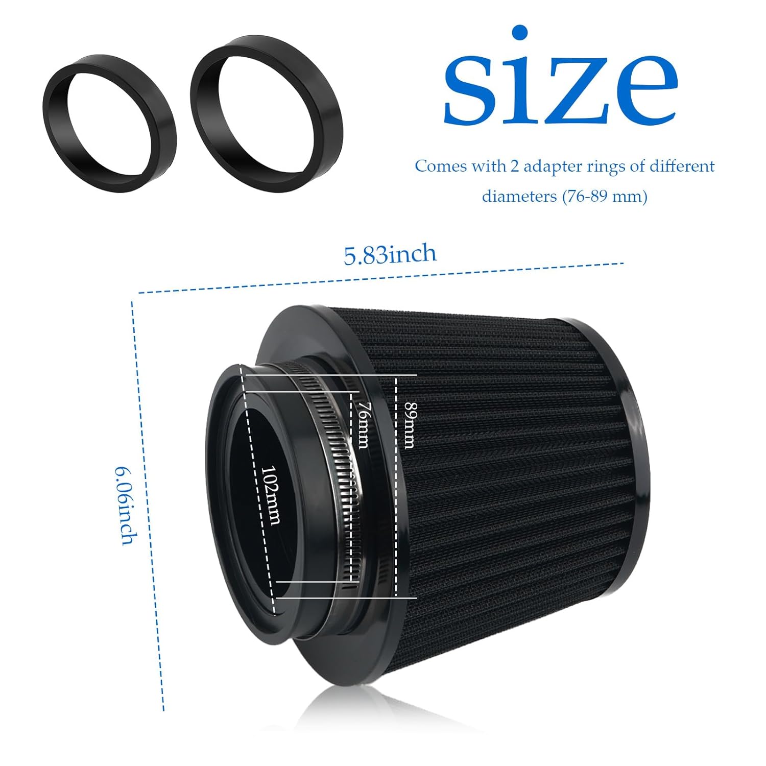 Com dimensões de 6.06 x 5.83 x 4.56 polegadas e três anéis adaptadores de diferentes diâmetros (76-89-102mm), este kit de filtro de ar é compatível com a maioria dos carros e motocicletas. É importante medir cuidadosamente o tamanho necessário antes de realizar o pedido para garantir a compatibilidade.