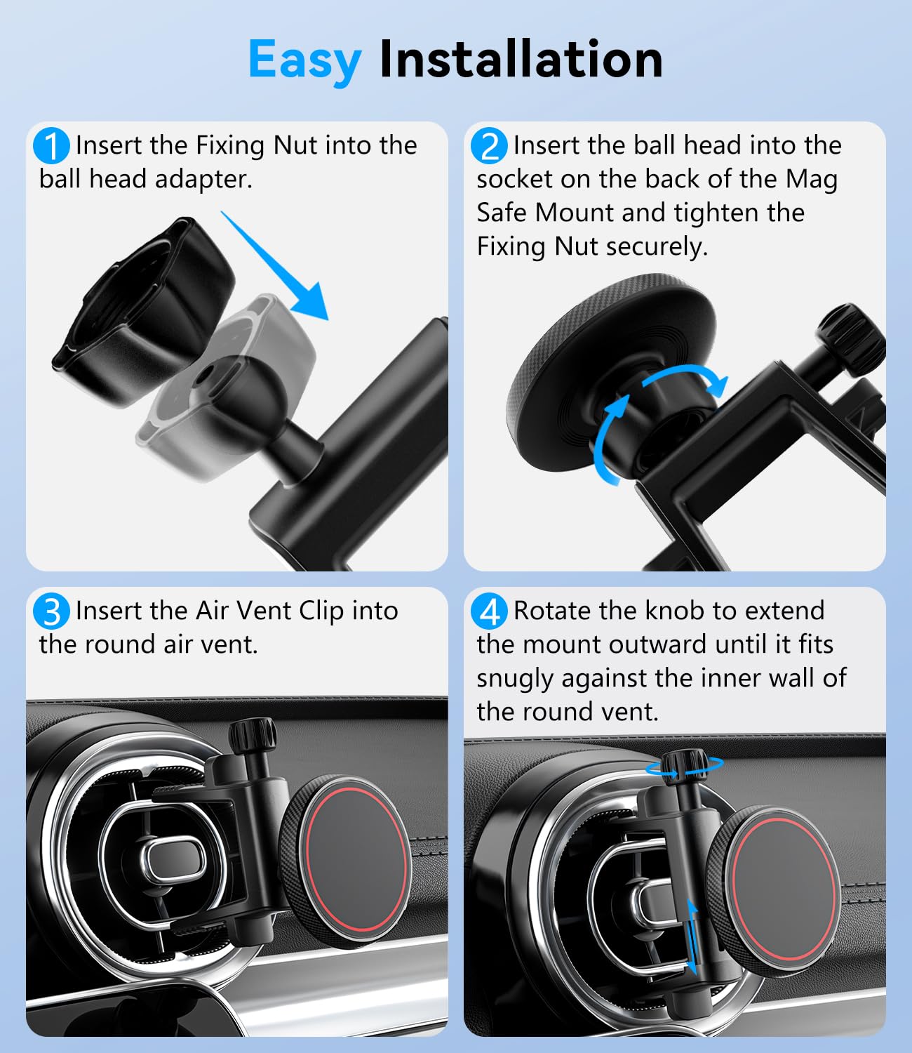 This magnetic car mount is perfect for Mercedes Benz and Mini Cooper models with round air vents. The strong magnet securely holds your phone, even on bumpy roads. Compatible with the latest iPhone models, it’s a practical and stylish accessory.