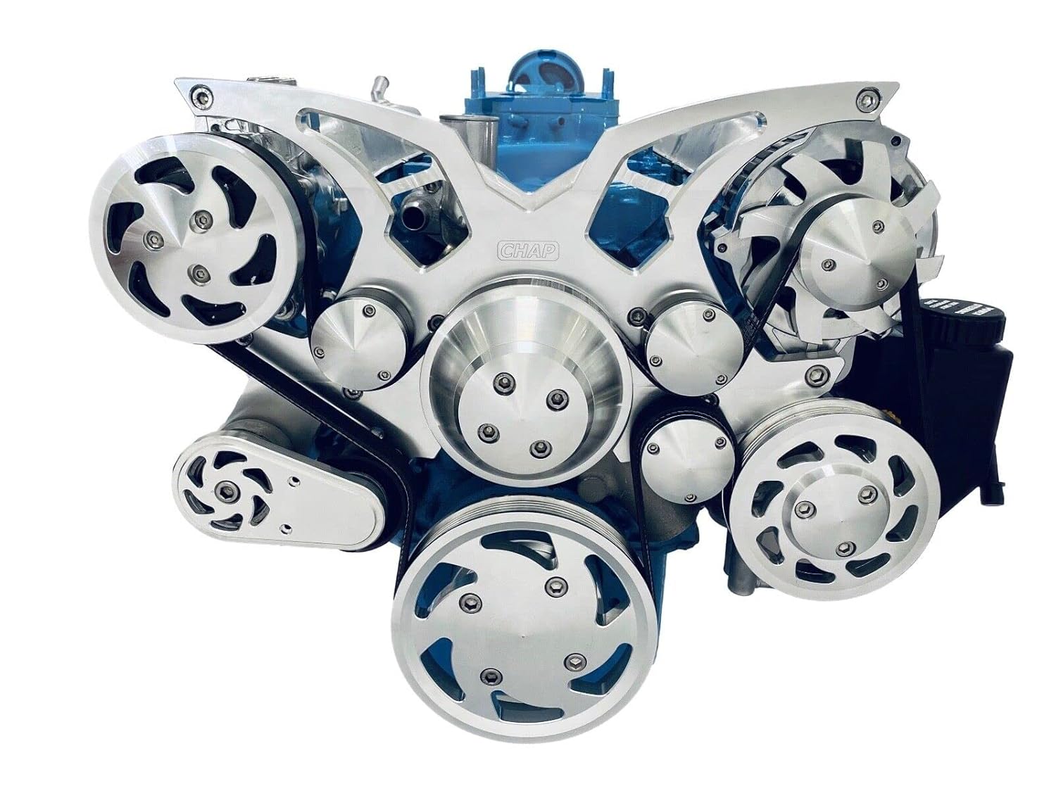 Kit de polias serpentina compatível com motores Small Block Ford 289, 302 e 351W, projetado para instalação no lado do passageiro. Inclui mangueira inferior do radiador e um amortecedor de 4 parafusos de 1969. Oferece melhor eficiência no sistema de ar-condicionado, alternador e direção hidráulica, além de otimizar o espaço sob o capô e melhorar a estética do motor. Ideal para quem busca desempenho e modernização no sistema de polias do veículo.