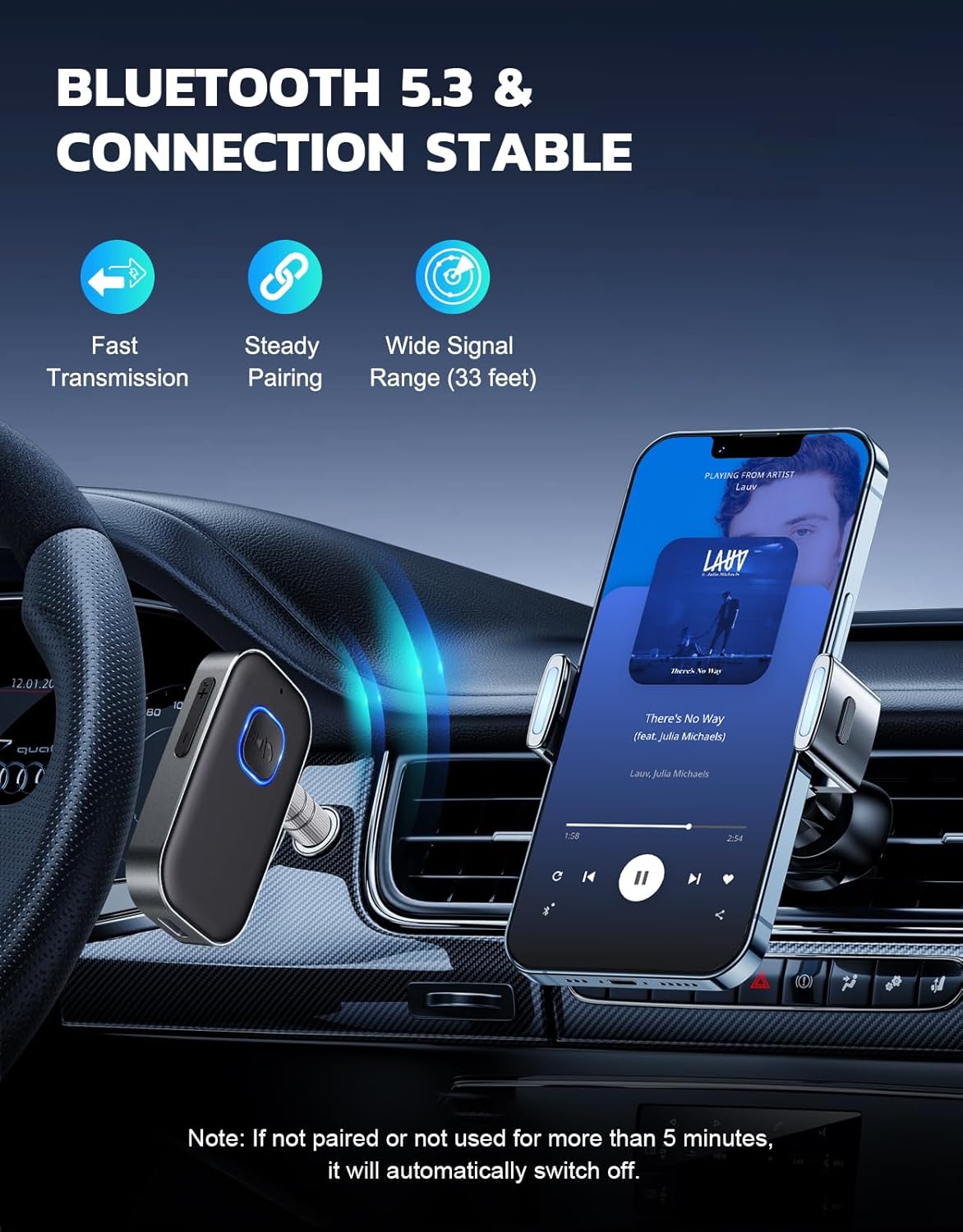 The J22 bluetooth receiver is a fantastic little unit that allows you to play music and podcasts on your old-school car stereo (as long as it has an AUX auxiliary port). It is extremely predictable and reliable once it is paired to your phone, immediately connecting when you power it on. It runs for 10+ hours on a single charge (which is via a USB-C port). It will automatically power down after a few minutes of being disconnected from your phone – great when you arrive at your destination – and avoid having to keep charging it. Sound quality is very good – at least as good as CD. It comes with both a short audio cable and that nice direct adapter for connection to your car head unit.Much better than finicky other bluetooth adaptors I have tried.