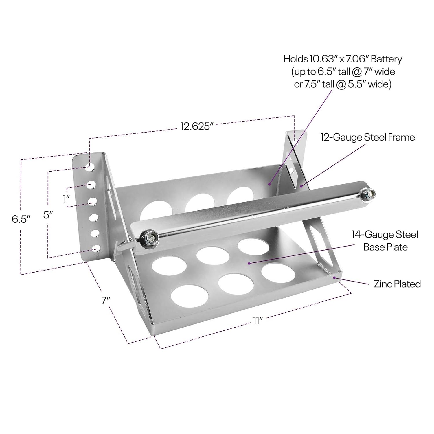 Além disso, a caixa é revestida com zinco, o que previne a ferrugem e a corrosão, garantindo uma durabilidade prolongada sem a necessidade de pintura ou revestimento adicional. Com dimensões versáteis, a bandeja da bateria possui um comprimento total de 14,38 polegadas, largura de 7,25 polegadas e altura de 6,5 polegadas, sendo capaz de acomodar baterias de até 10,63 polegadas de comprimento, 7,06 polegadas de largura e 7,5 polegadas de altura.