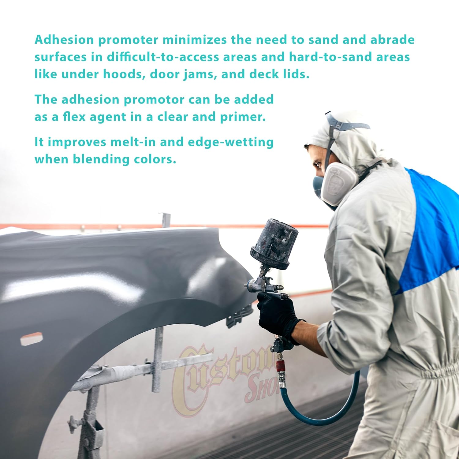O promotor de adesão minimiza a necessidade de lixar e abrasar superfícies em áreas de difícil acesso, como sob capôs, em batentes de portas e tampas de porta-malas. Além disso, pode ser adicionado como um agente de flexibilidade em tintas transparentes e primers, melhorando a fusão e a umedecimento das bordas ao misturar cores. Ele também proporciona uma adesão excepcional antes da aplicação de produtos de revestimento para caçambas de caminhões, como Custom Coat, UPol Raptor e Gator Guard.
