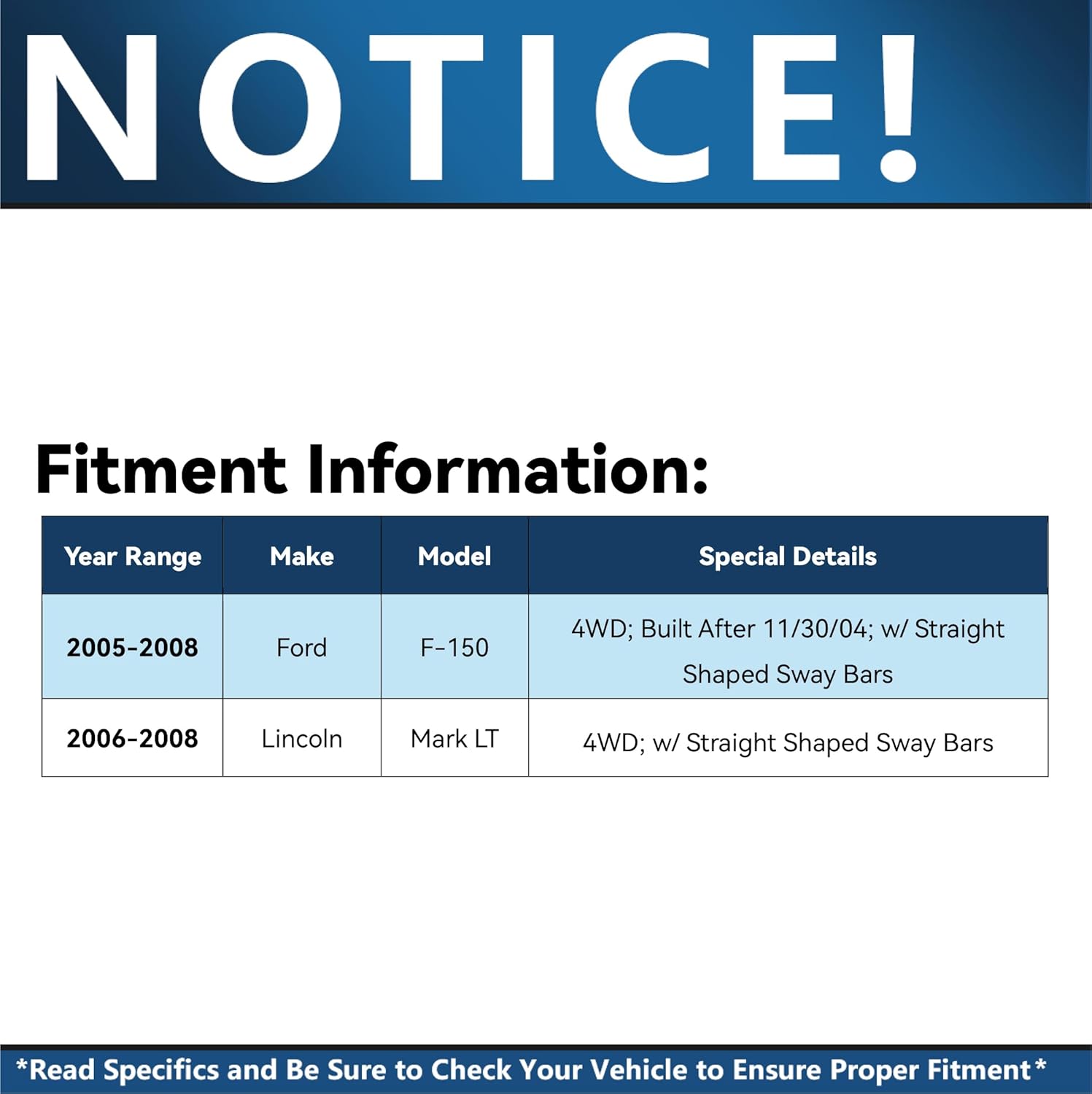 – Compatibilidade: Projetado para veículos 4WD, o kit se encaixa perfeitamente em modelos de F-150 fabricados após 30/11/2004 e nos Lincoln Mark LT de 2006 a 2008.