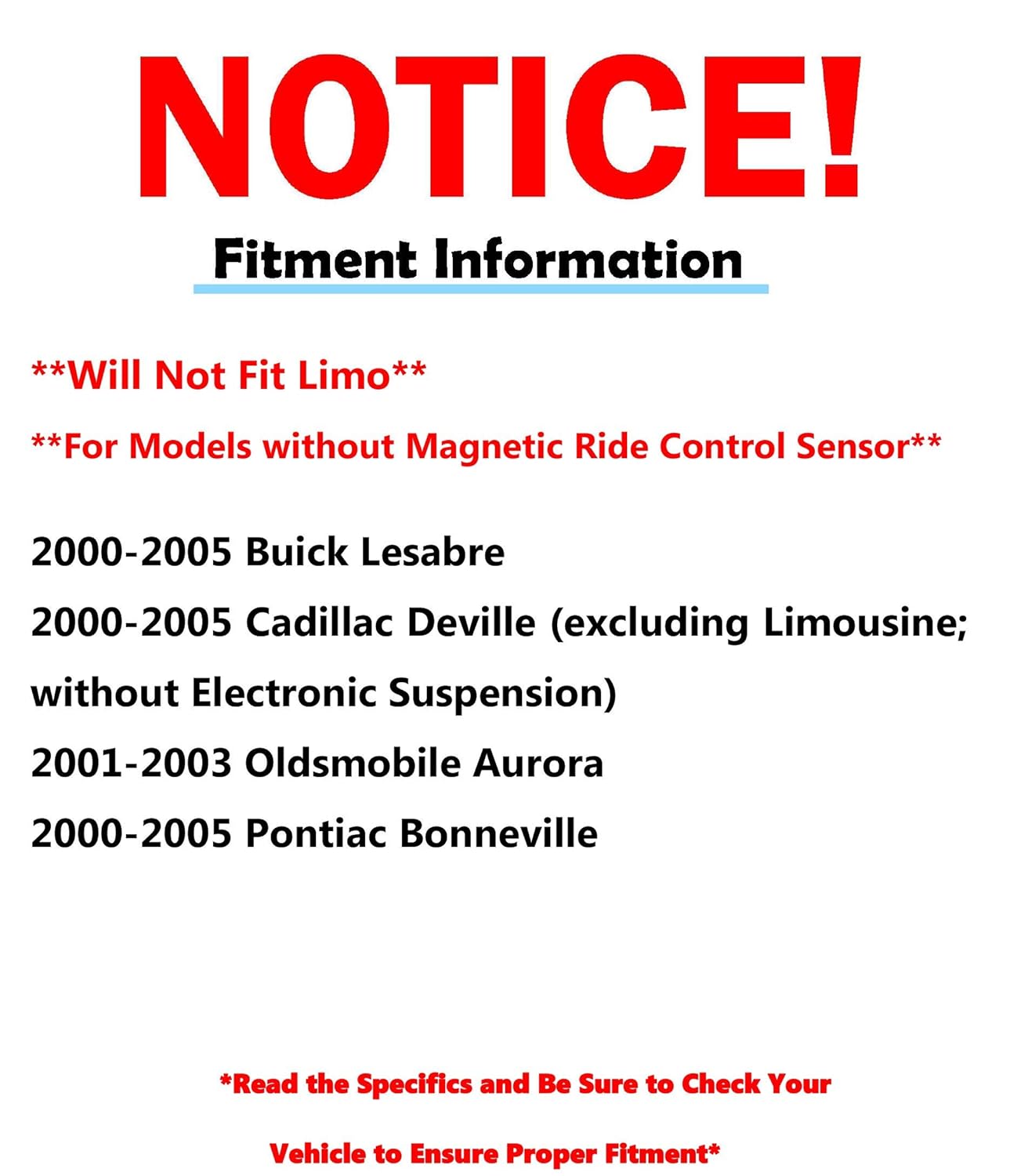 – Compatibilidade: Projetado para Buick LeSabre (2000-2005), Cadillac DeVille (2000-2005, exceto suspensão eletrônica e chassi comercial), Pontiac Bonneville (2000-2005) e Oldsmobile Aurora (2001-2003).