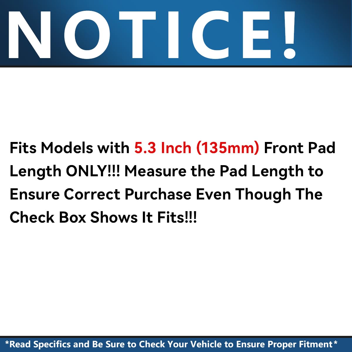 The seller states multiple times to verify the size of existing pads… there is a reason for this. The Tundra has both a 4.7″ and 5.3″ pad length. The only way to verify this is to visually inspect the pads on your truck. I made the mistake of getting the 5.3″ when in fact mine had 4.7″. Had to grab a set from the local automotive store as I was in the middle of a brake job and needed to wrap it up. Seller was responsive and the size is clearly identified on the product page. BTW… The rotors are working great.