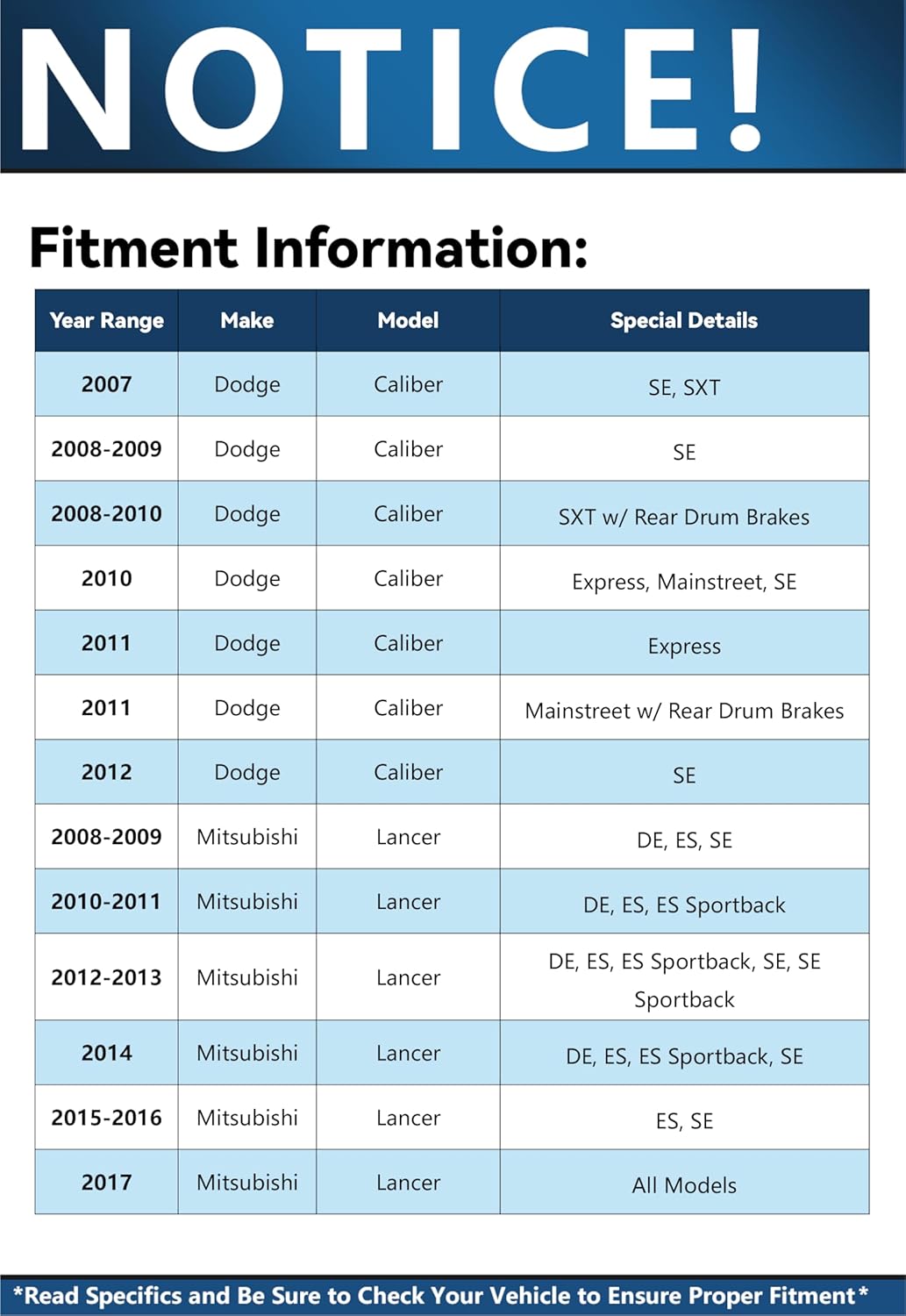 – Dodge Caliber: 2007 (SE, SXT), 2008-2009 (SE), 2008-2010 (SXT com freios traseiros a tambor), 2010 (Express, Mainstreet, SE), 2011 (Express, Mainstreet com freios traseiros a tambor), 2012 (SE).