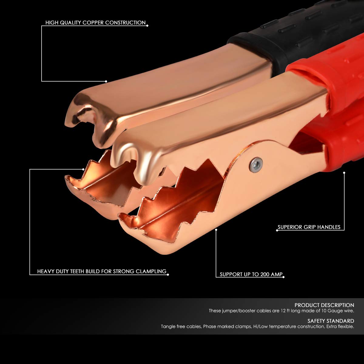 I would prefer full copper wire, not just copper-coated aluminum. I like the heavy-duty clamps, unlike those flimsy thin walled things that some vendors offer. The length is a plus when You have a dead battery,& are boxed in between others in the parking lot, you can still get a jump from a vehicle at the back of your car.