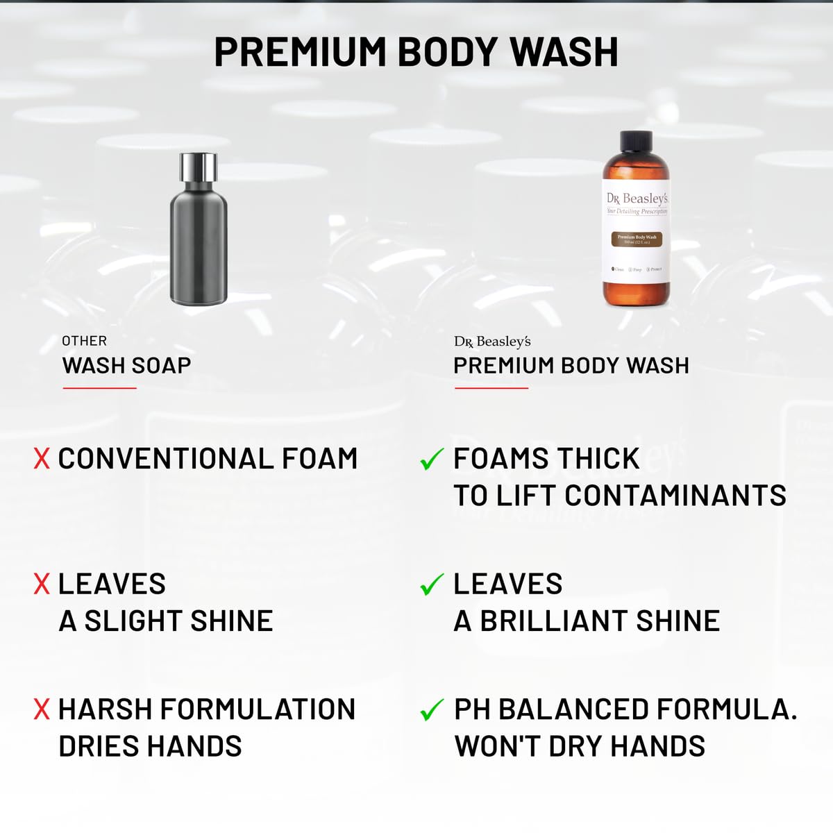 Resposta: O Dr. Beasley’s Premium Body Wash se destaca por sua fórmula biodegradável, alta lubrificação e capacidade de criar uma espuma densa que levanta contaminantes, minimizando o risco de arranhões.