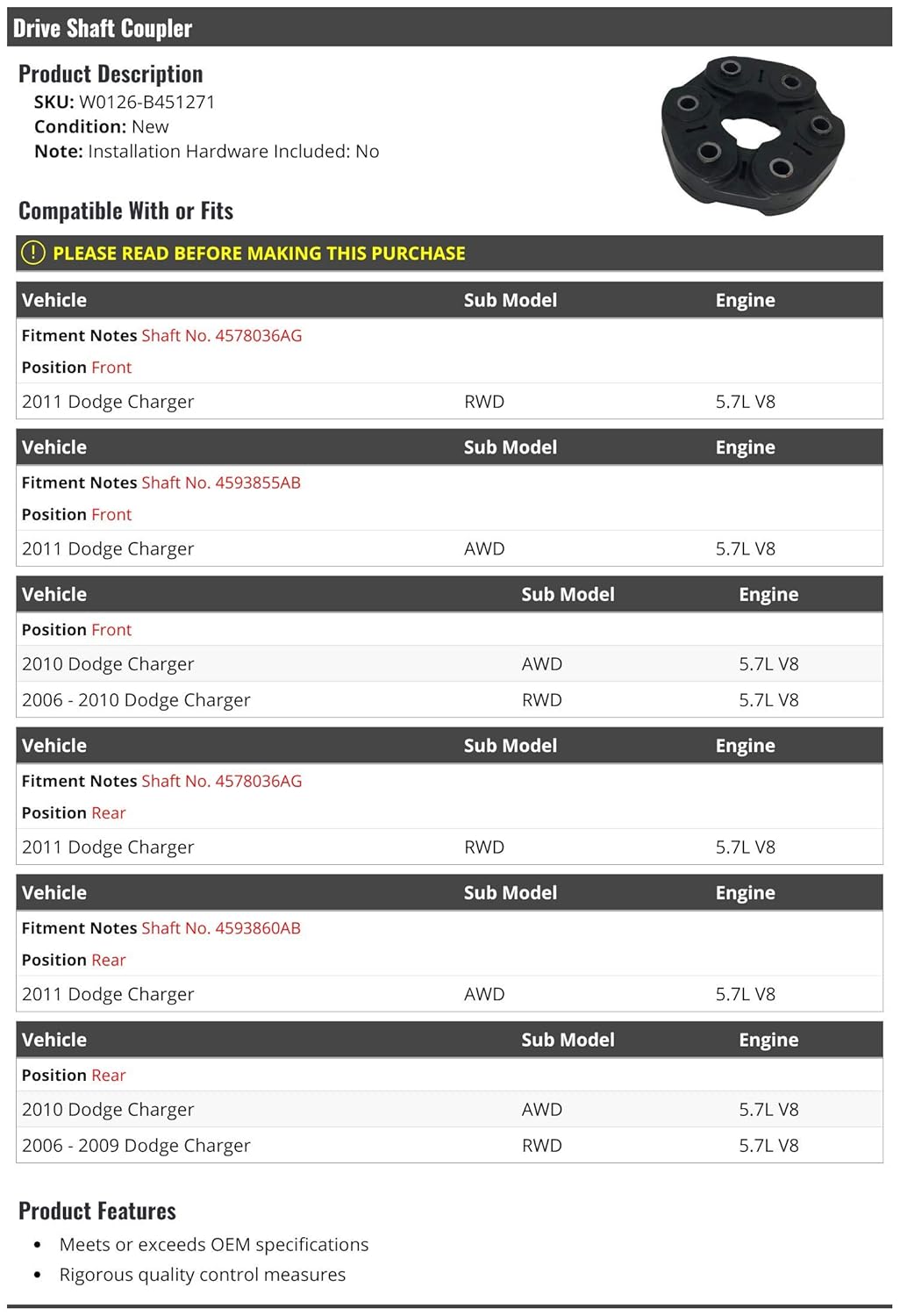 Compatível com os números de eixo 4578036AG e 4593855AB, este acoplador é adequado para as posições frontal e traseira, dependendo do modelo e do tipo de tração do seu Charger. Para os modelos RWD de 2006 a 2010 e AWD de 2010 a 2011, o acoplador assegura uma conexão robusta e confiável, minimizando vibrações e melhorando a transferência de potência do motor para as rodas.