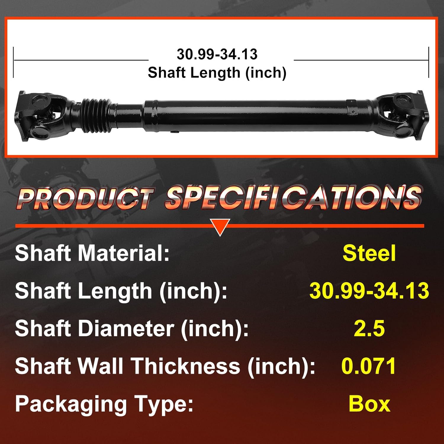 – Descrição do Produto: Comprimento de instalação (mais curto): 30.99 in; Comprimento de instalação (mais longo): 34.13 in; Diâmetro do eixo: 2.5 polegadas; Material do eixo: Aço; Tipo de embalagem: Caixa.