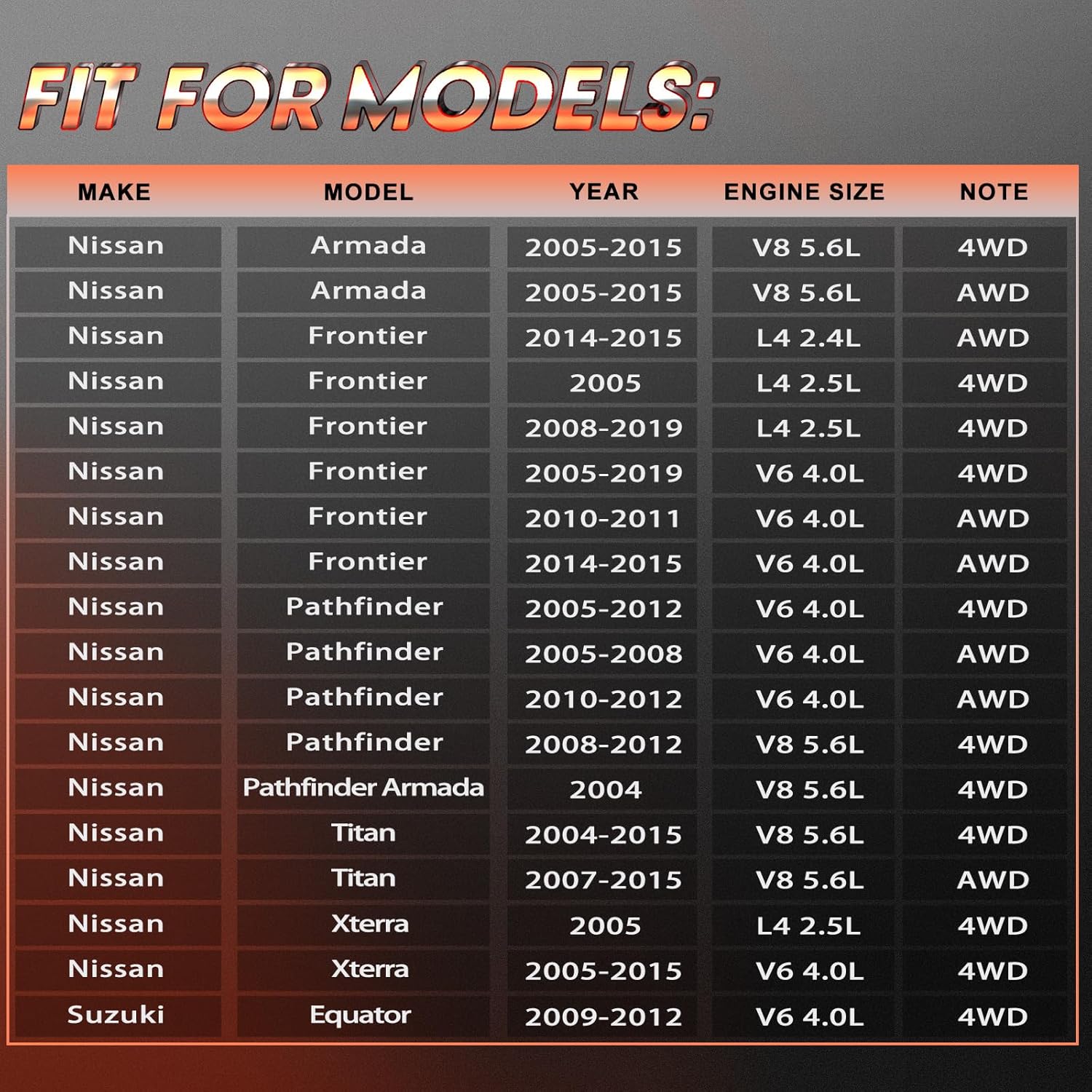 – Veículo Fitment: Compatível com Nissan Armada 2005-2015 5.6L AWD, Nissan Frontier 2005-2019 2.4L/2.5L/4.0L AWD, Nissan Pathfinder 2005-2012 4.0L/5.6L 4WD, Nissan Pathfinder Armada 2004 5.6L 4WD, Nissan Titan 2004-2015 5.6L 4WD e Nissan Xterra 2005-2015 2.5L/5.0L 4WD.